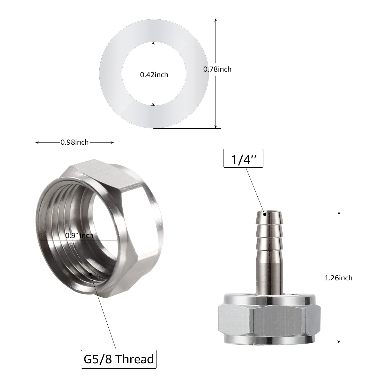 - 1/4'' Beer Barb and Standard G 5/8 Thread: O.D 1/4'' beer barb can be attached to I.D 1/4'' or 3/16'' beer dispensing line, G 5/8 thread hex nut can be screwed on most standard thread sankey keg coupler.