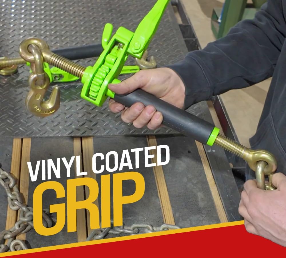Check out our 5/16" - 3/8" Hi-Viz Green Quick Ratchet Chain Binder w/ Folding Handle of 7,100 lbs working load limit. The easier-to-install binder is compatible with Grade 70 and Grade 80 tie-down chains of 5/16" and 3/8" sizes. It will enable you to secure heavy equipment and loads during transportation, preventing shifting/loosening of the loads. Moreover, it includes a tightening & loosening lever, foldable handle, ratchet mechanism, vinyl-coated grip, zinc-plated grab hooks, and more. Check out the detailed explanation below:- Measurements: Our ratchet binder has a foldable handle with an overall length of 13-7/8" and a handle length of 9-1/2". It will collapse to 180 degrees, securing it in position when not in use, providing plenty of storage space, and minimizing the risk of damage during transport. The grab hooks are securely connected to the eye hook of the binder, which can retract and extend from 22-1/2" to 29". Additionally, the take up is 6". Quality Construction: We have engineered our ratchet chain binders from durable and robust steel that can withstand tension and stress while securing the loads. The binder is powder-coated with safety green to ensure high visibility during transportation and operation. Workers and vehicles will have clear visibility of the loads, warning them to keep a necessary distance. The metal is heat-treated and proof-tested for durability. Unique Design: You will find zinc-plated grab hooks to withstand the rigors of transportation. The coating will protect the hooks from scratches, corrosion, and rust. Our binder also includes a vinyl-coated barrel for a firm grip during operation. Lastly, it has a folding handle to save space and prevent injuries. Ratchet Mechanism: These load binders have a ratchet mechanism to tighten and loosen the chain as per the desired tension. The handle is foldable, enabling you to secure it when not in use and lock the lever, preventing accidental release of tension during transport. You can also use a padlock (sold separately) for an external locking system, preventing theft. Working Load Limit: We have designed our ratchet load binder to withstand a working load limit of 7,100 lbs and a breaking strength of 28,400 lbs. It also complies with the rules and regulations of CVSA & DOT Requirements, making it a highly secure and efficient binder. Do not exceed the load limit as it may lead to accidents or injuries. Operation: Check out the complete installation process to save you time:-