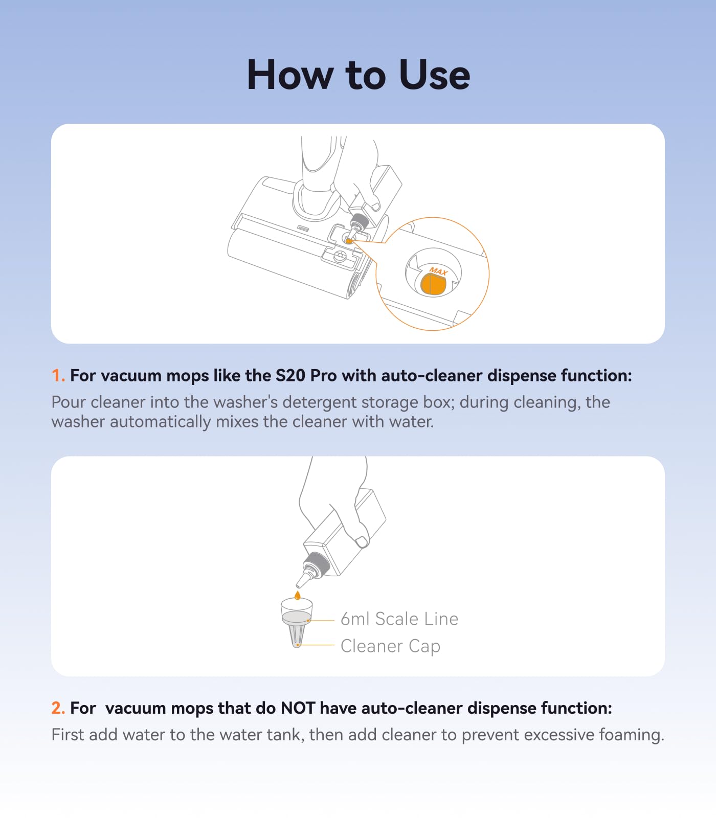 - 🟣 Economical Usage: A single 200ml bottle offers up to three months of cleaning, thanks to the Narwal S20 Pro’s efficient use of approximately 5-6ml of detergent per cleaning session.