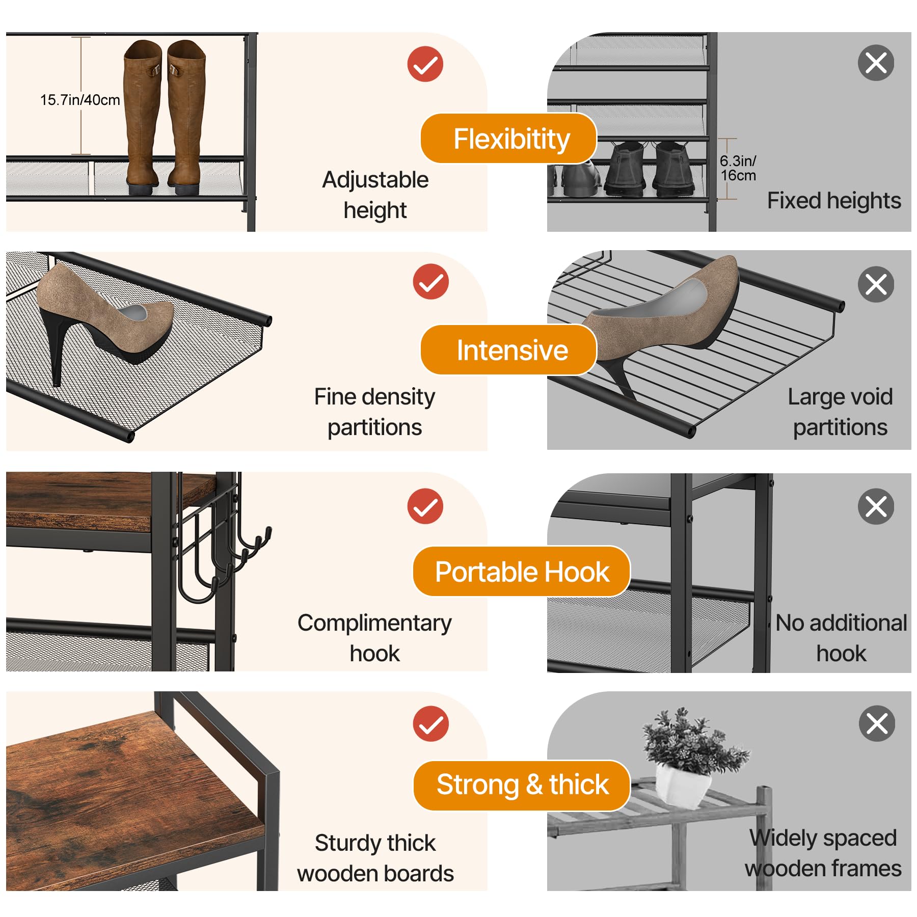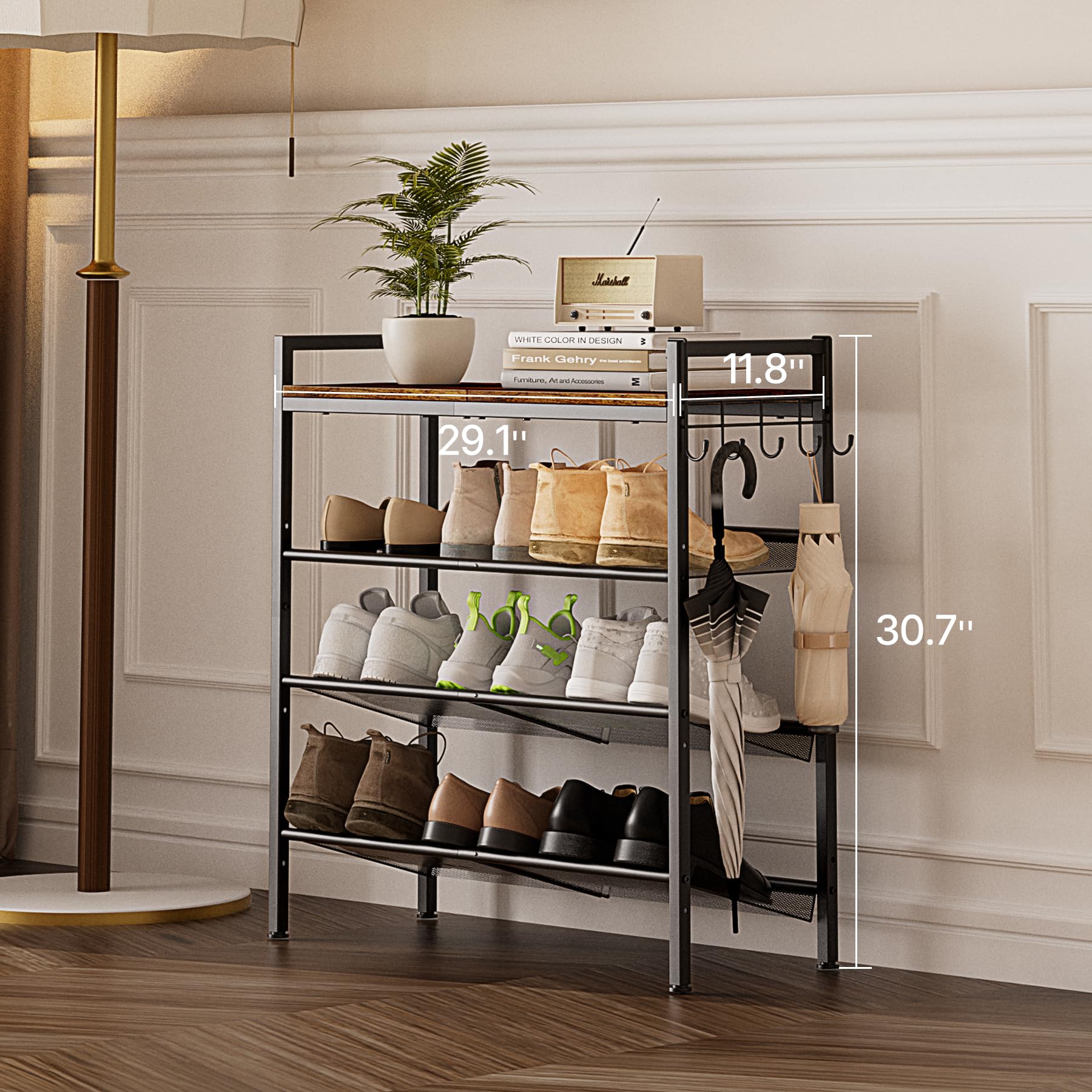 neatevday 4 Tier Shoe Rack, Shoe Rack for Front Door Entrance with Hook, Shoe Organizer with Adjustable Mesh Shelves, Metal Shoe Rack for Entryway, Closet, Bedroom Living Room Garage