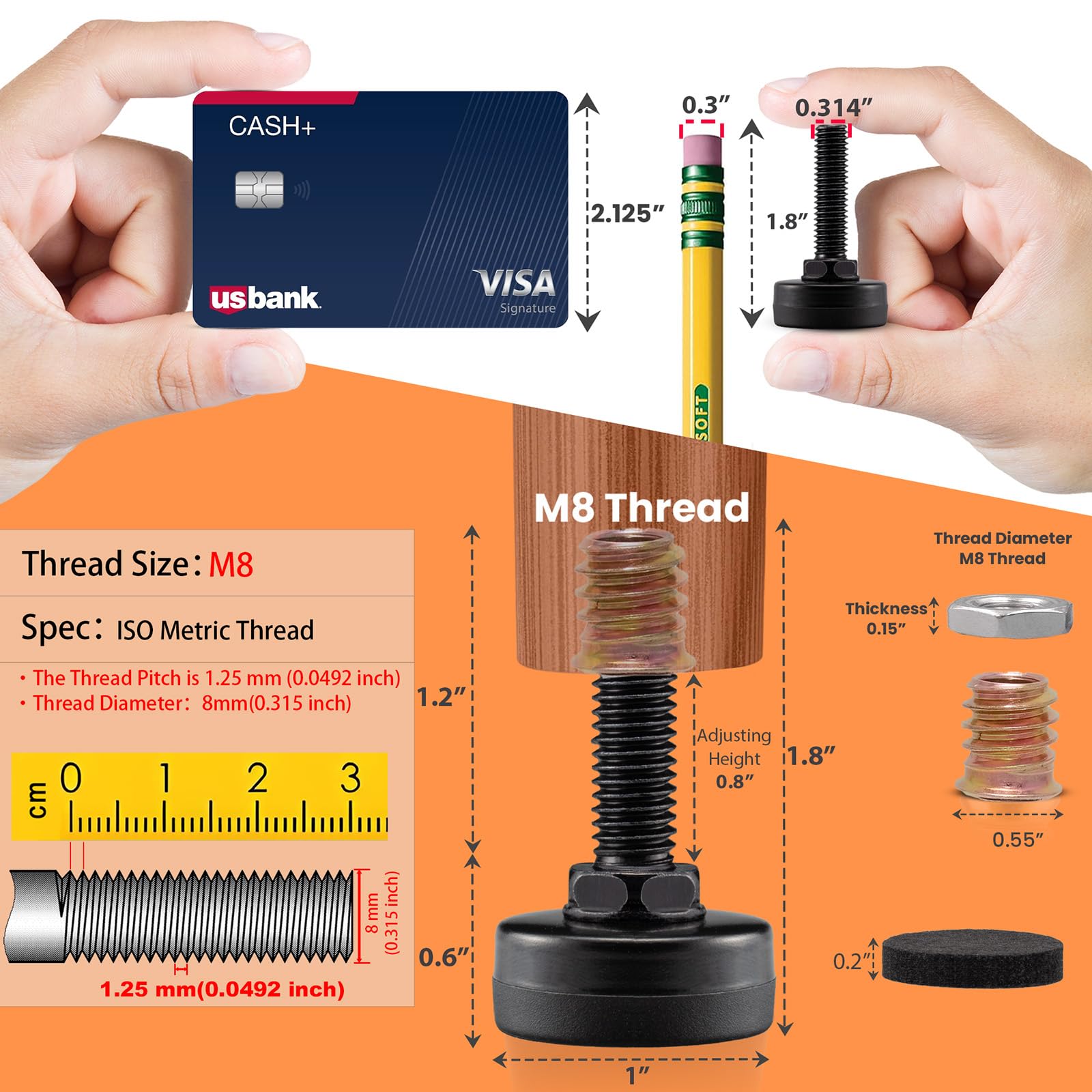 - ✅【M8 Thread Furniture Levelers】❗❗❗Ensure furniture compatibility by measuring for the right leveling feet size in metric units. For M8x1.25mm threaded legs, easily adjust by screwing in the leveler. For non-threaded legs, simply pre-drill a hole for a tight, secure leveler fit.