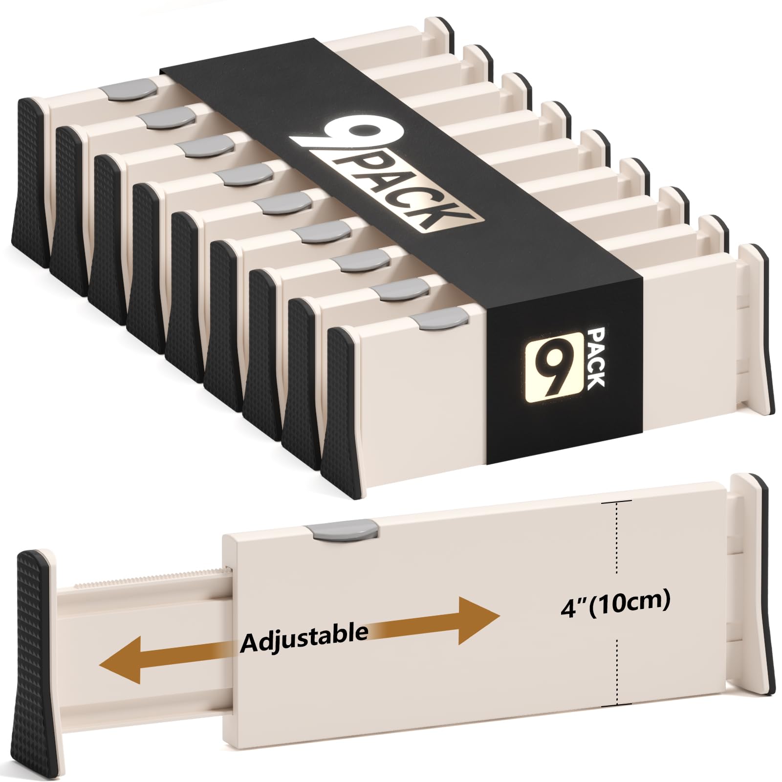 NTQNOIKA Drawer Dividers Organizer 9 Pack, Adjustable Separators 4" High Expandable from 11-17" for Bedroom, Bathroom, Closet, Clothing, Office, Kitchen (Beige, 9 PACK)