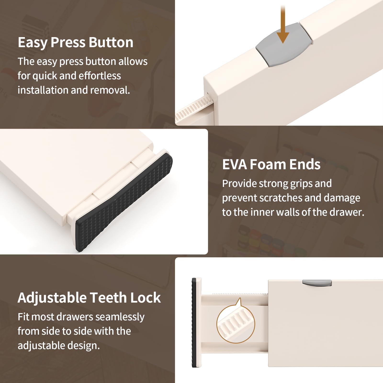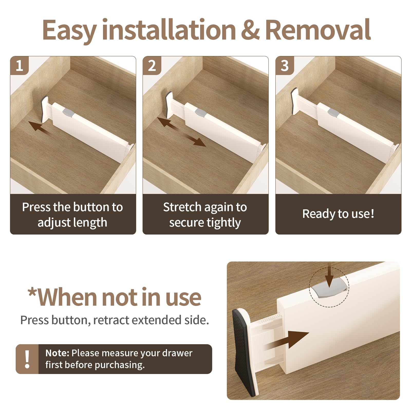 - Easy To Install: Adjust the divider to a suitable length before install, through strong spring tension and silicone friction makes drawer divider more stable. When not in use, just press the button and push back the extendable side panel.(Note: Clean the drawer before use)