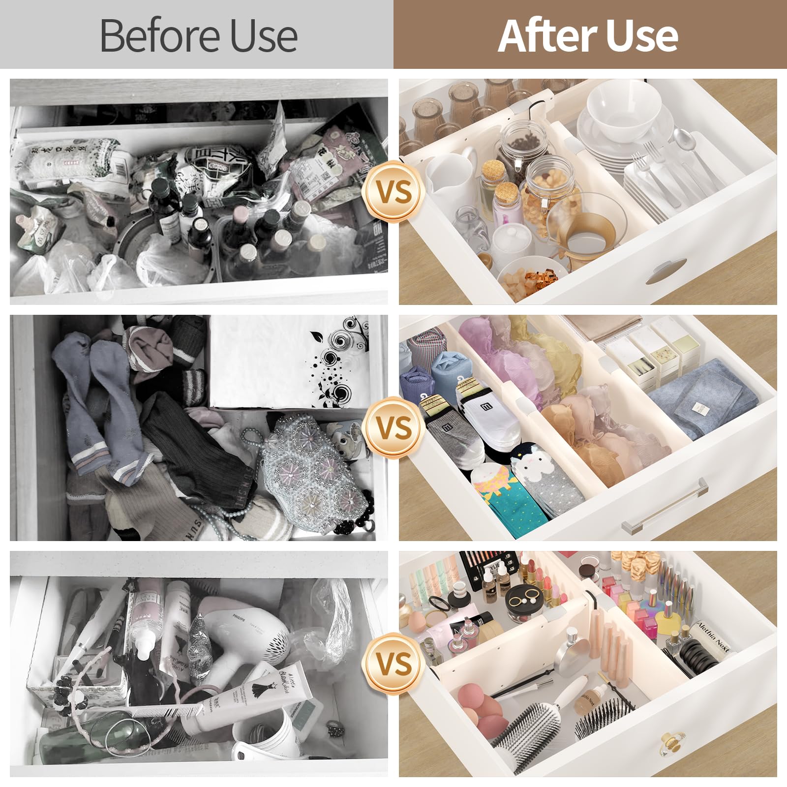 - Multi-Functional: These drawer organizers can be installed in any drawer of your house or office. Perfect for organizing clothes, kitchen utensils, office supplies, makeup, bathroom clutter, and more. Ideal for keeping your belongings organized and easy to find.