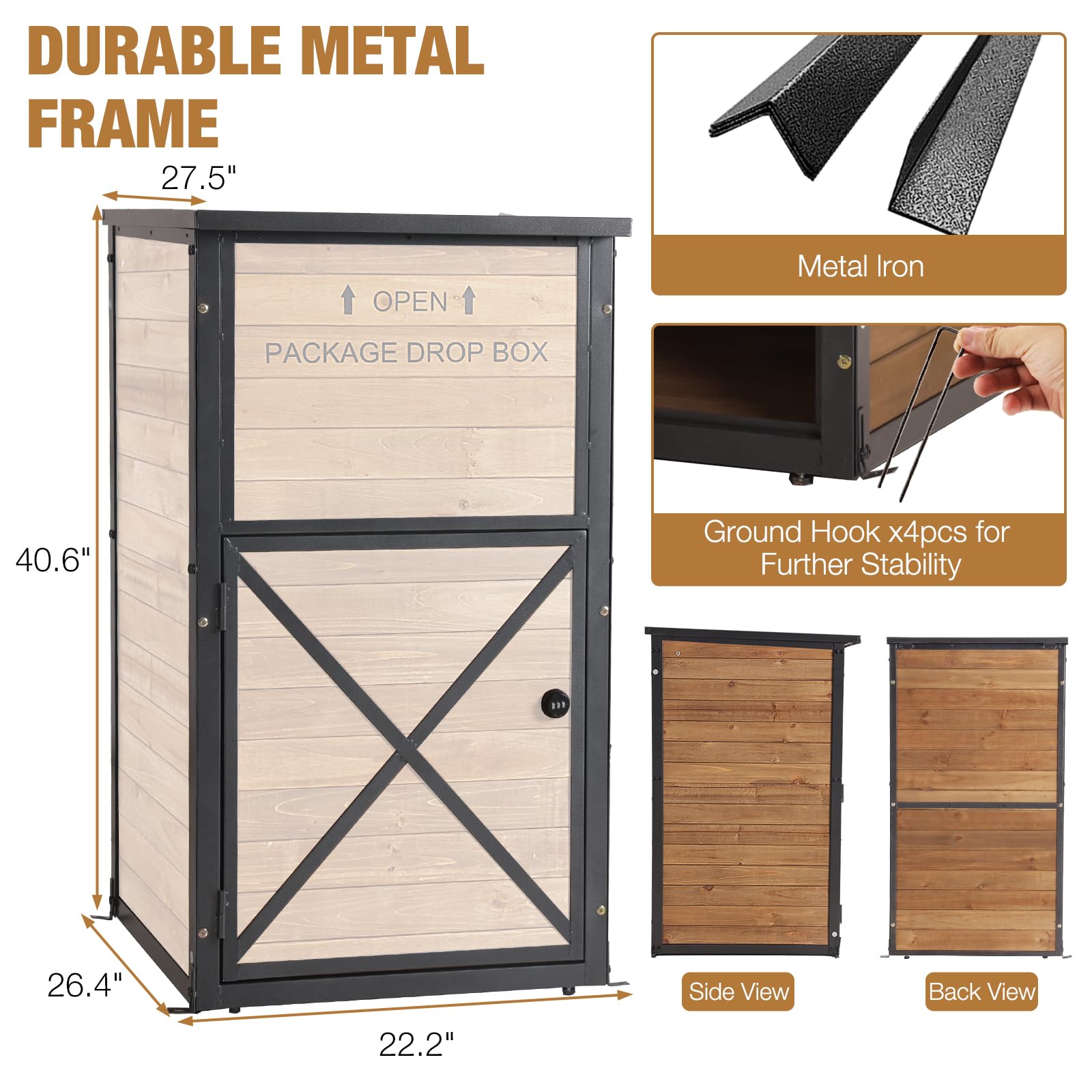 Package Delivery Box for Porch with Lockable Secure, Large Outdoor Parcel Storage Anti Theft -Waterproof Parcel Mailbox with Iron Frame & Natural Wood