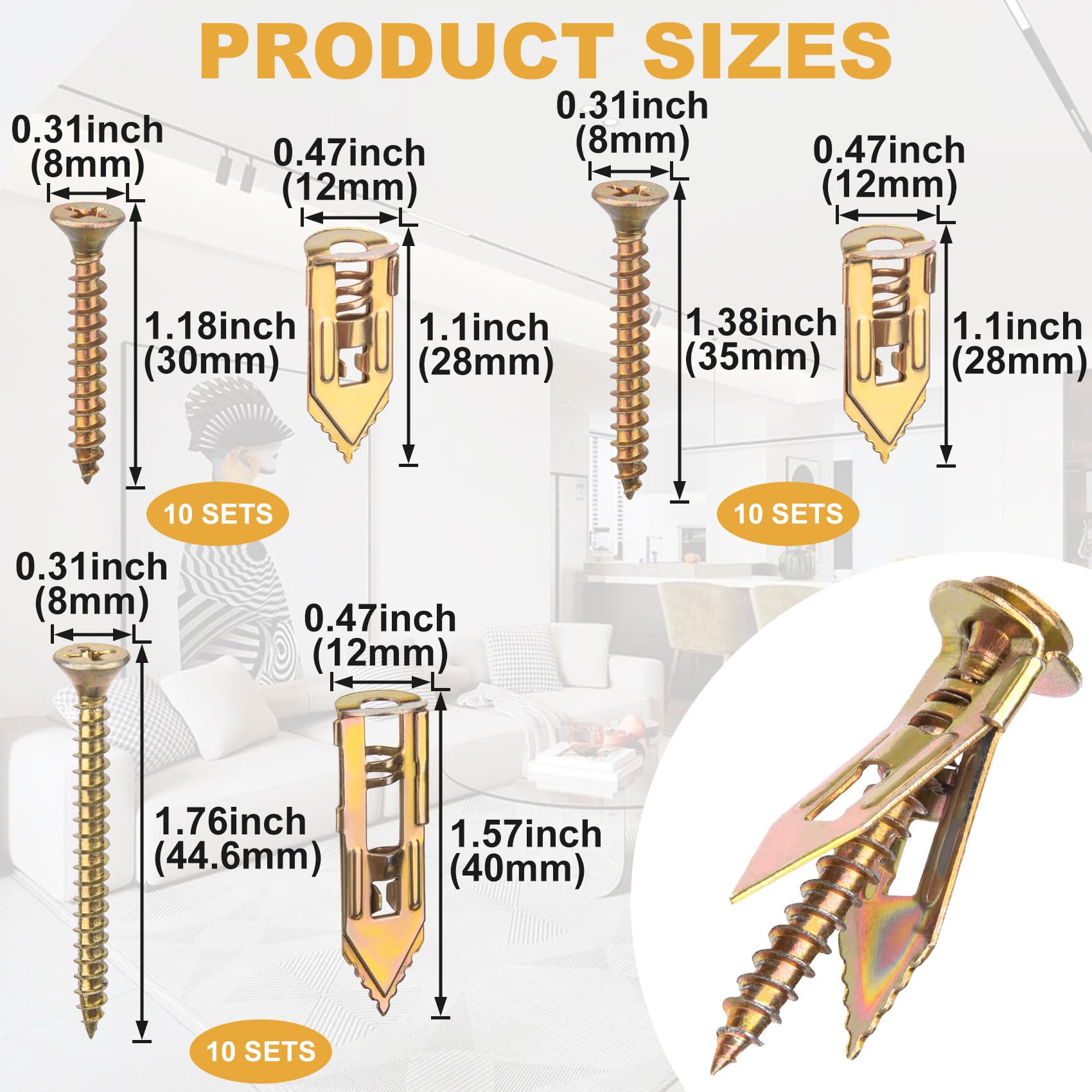 Material: These anchors and screws are made of high-quality steel with zinc plated, strong and stable, not easy to be deformed or damaged. Featuring an expanding design with pronged anchors and tapered tips, the two sides expand relative to each other when the screw is tightened, the holding power is very stable, they can be used for a long time.