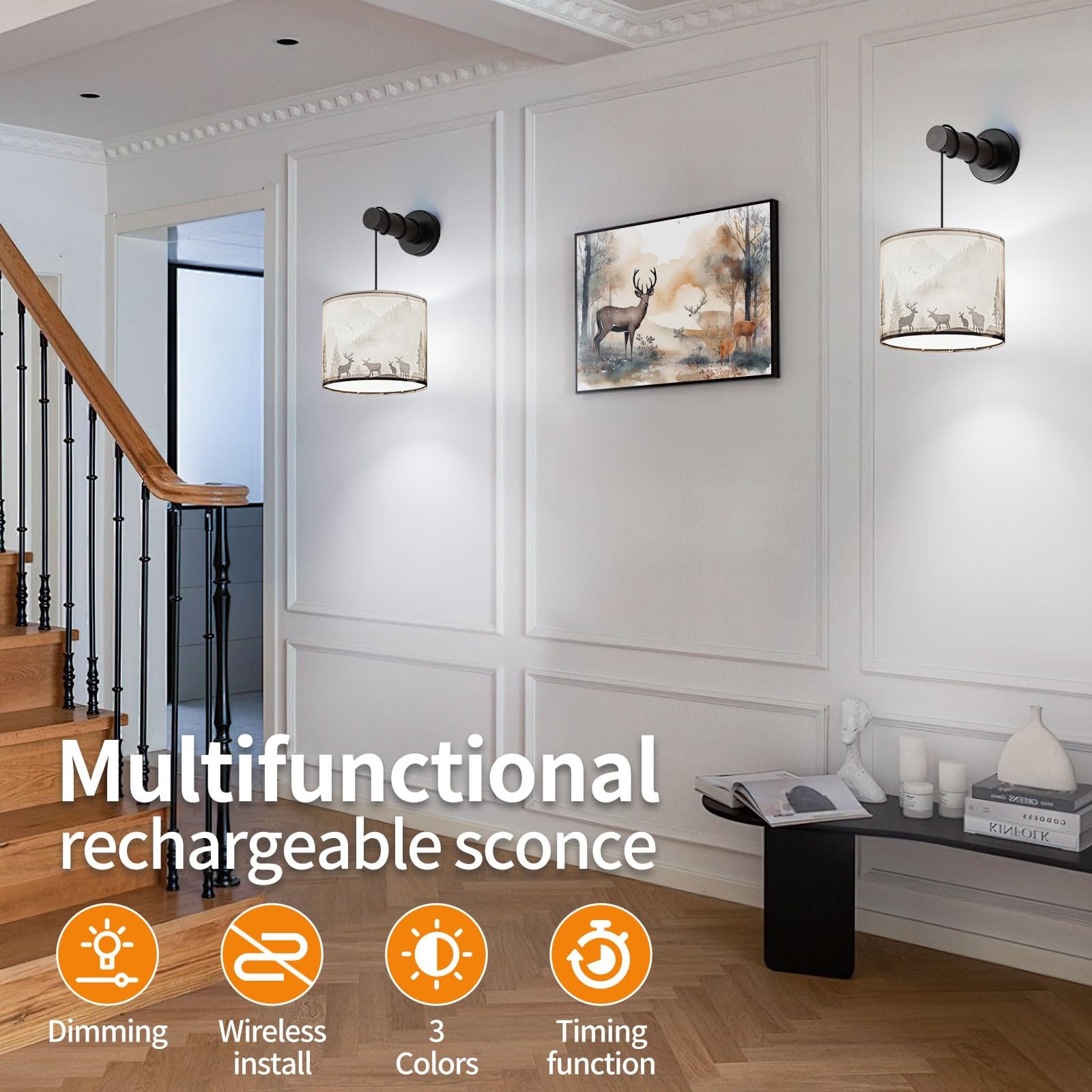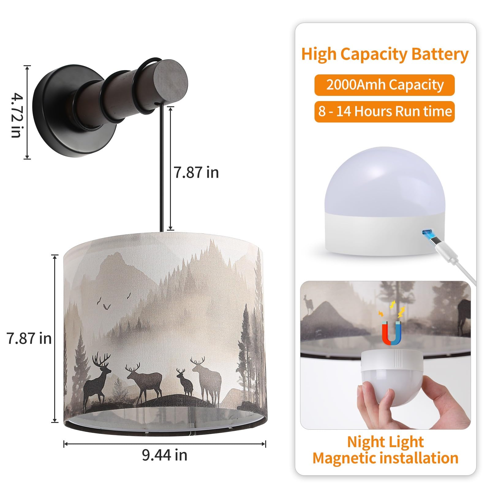 - 【Elegant Deer Design】Each wireless wall sconces set of two has a high-definition deer pattern shade and wooden rod. The natural and fashionable design style of battery wall sconces set of two is suitable for bedroom, living room, hallway and many other places.