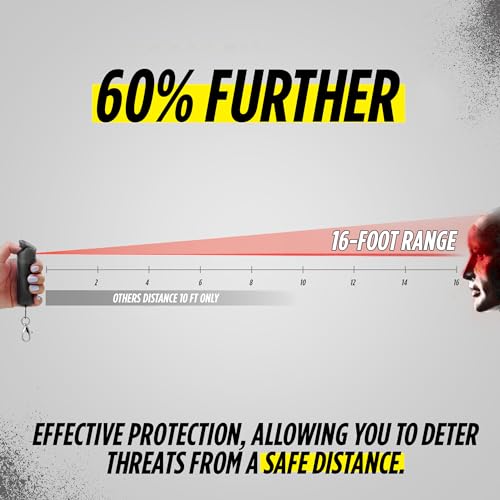 - 16-FOOT LONG RANGE CAPABILITY: With an impressive 16-foot range, this pepper spray provides effective protection, allowing you to deter threats from a safe distance, enhancing your safety and confidence in any situation. This pepper spray boasts a long-range capability, reaching distances of up to 16 feet, ensuring you can effectively deter potential threats from a safe distance, enhancing your safety and security.
