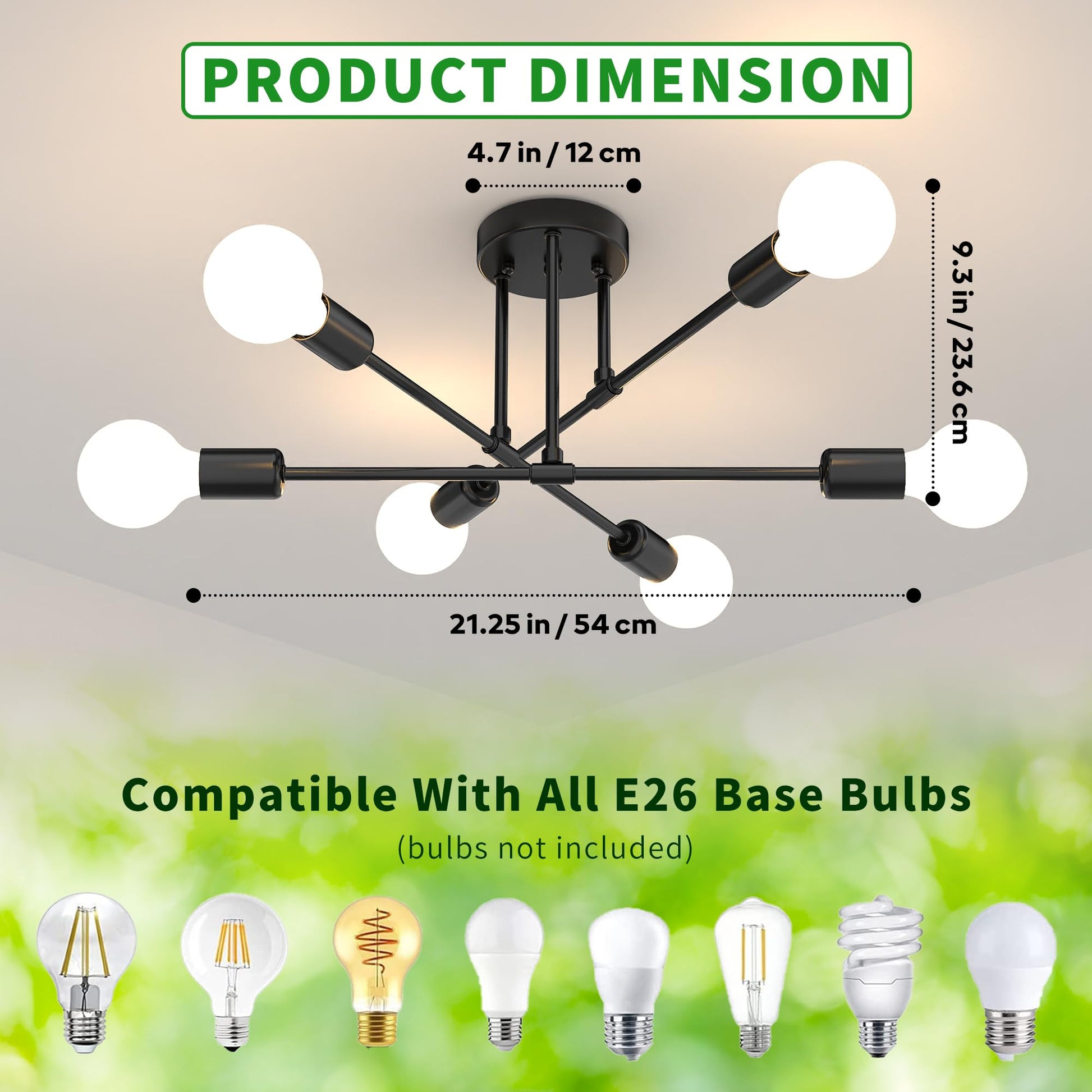 Phaosio Modern Sputnik Chandelier Ceiling Light Fixtures, 6-Lights 22” Mid Century Industrial Metal Semi Flush Mount for Dining Room, Bedroom, Living Room-Black