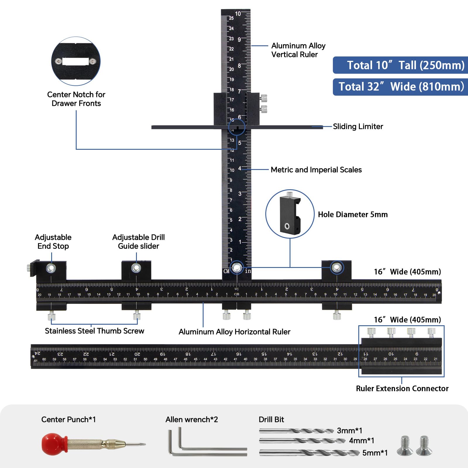 PRO Cabinet Hardware Jig, 32-inch Detachable Cabinet Handle Jig with Auto Center Punch, Aluminum Alloy Cabinet Handle Template Drill Guide, Cabinet Pull Jig for Handle Knob Pull, Drawer/Door