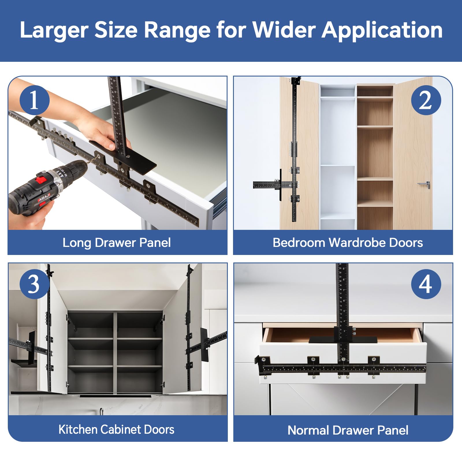 - 【32-inch Size Range for Wider Application】We upgrade our cabinet hardware jig to meet various sizes of handles, lets you easily adjust drilling distances to install different sizes of handles, knobs and pulls on kitchen cabinet doors and drawers.