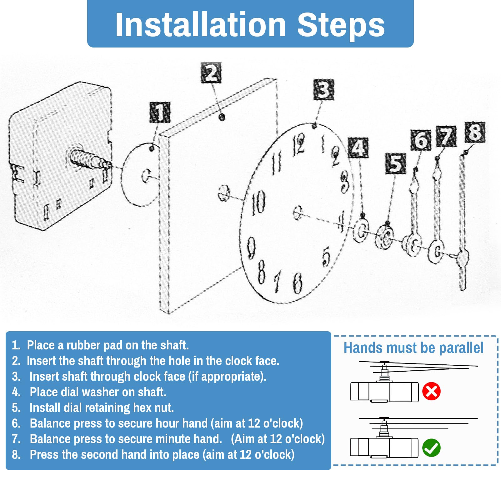 - Tool-Free Installation System: Pre-assembled hexagonal nut modules with anti-slip rubber pads enable barehanded mounting Reverse-thread security nuts prevent mid-operation loosening, High-torque quartz movement engineered for precision timekeeping. Universal shaft diameter fits 98% standard clock hands