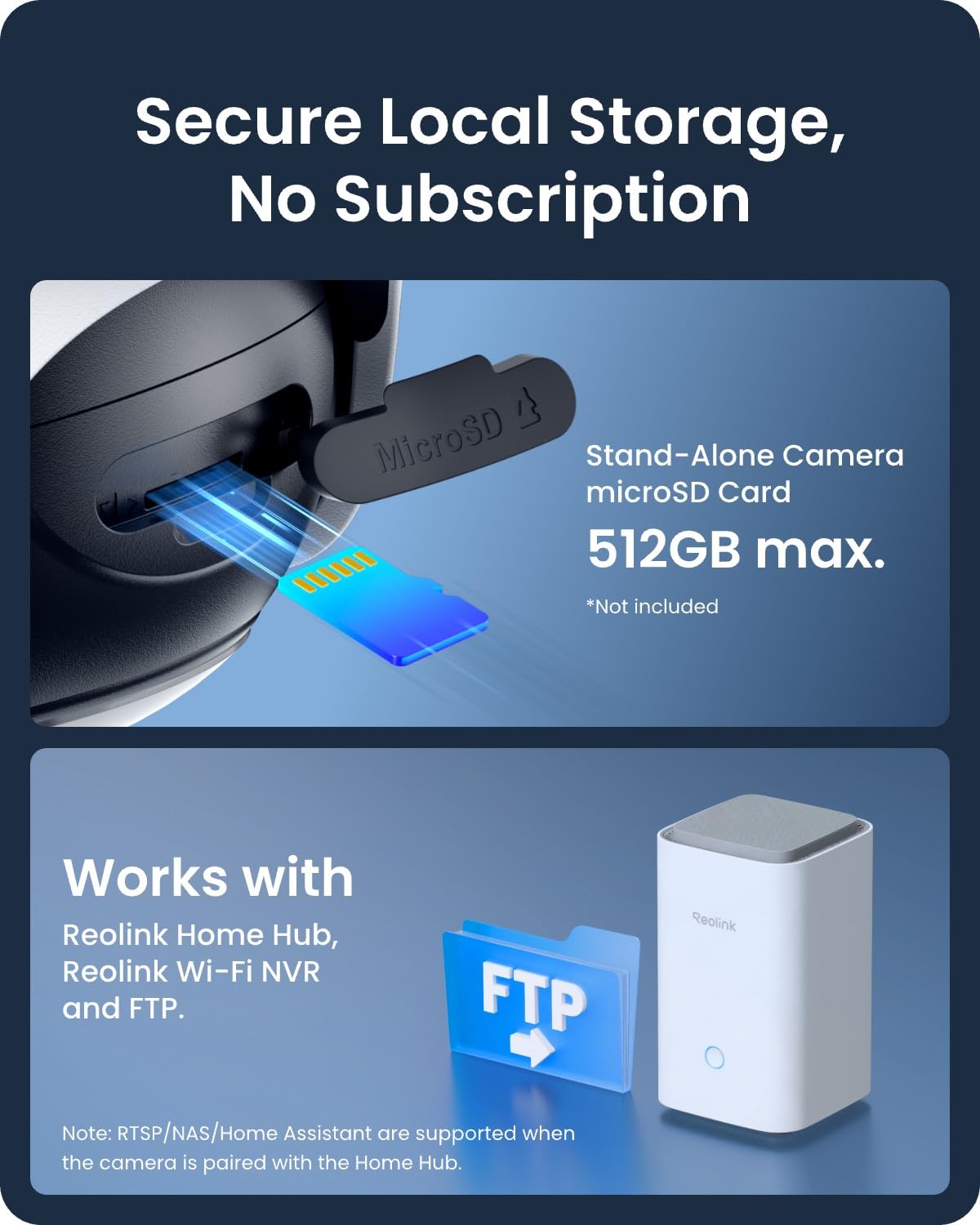 - Dual-Band WiFi 6 + Flexible Storage Options: 2.4GHz and 5GHz dual-band WiFi with Wi-Fi 6 support ensures faster, more stable connections. Save footage locally to a microSD card (up to 512GB), Reolink Home Hub, or FTP server—no subscription fees.