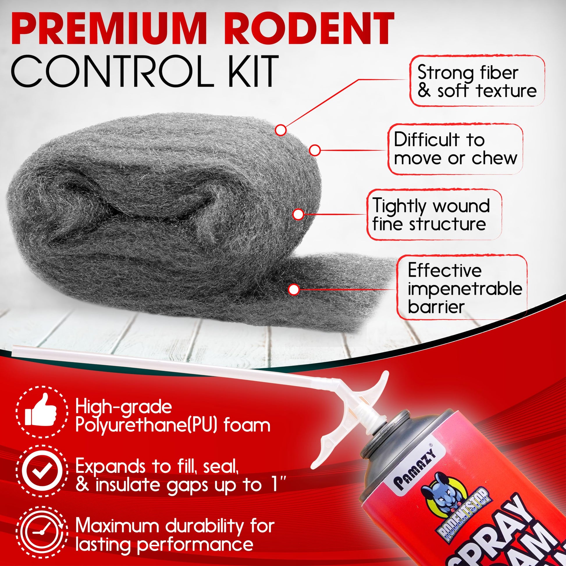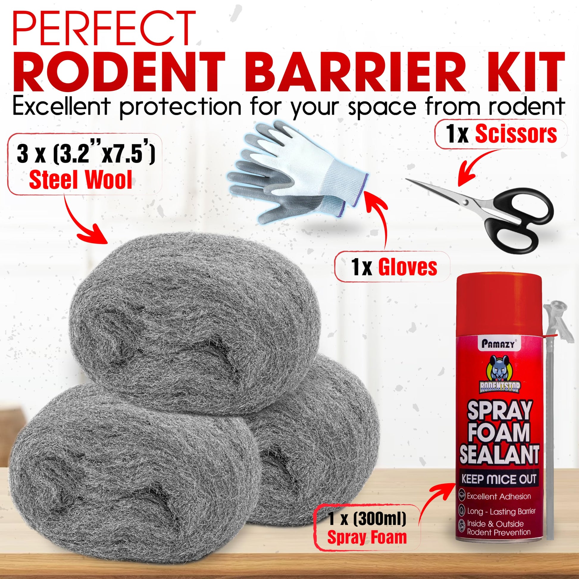 - [Complete Rodent Barrier Kit—Keep Your Space Safe] This steel wool and foam sealant kit is perfect for blocking entry points around your home, including in garages, kitchens, attics, basements, windows, around pipes, and more. It also works for polishing surfaces and removing stains like paint and dirt, making it a versatile tool for both mice & rodent control and cleaning tasks throughout your home. PACKAGING: 3x Steel Wool (3.2"x7.5 FT), 1x Spray Foam (350ml), 1x Gloves, 1x Scissors