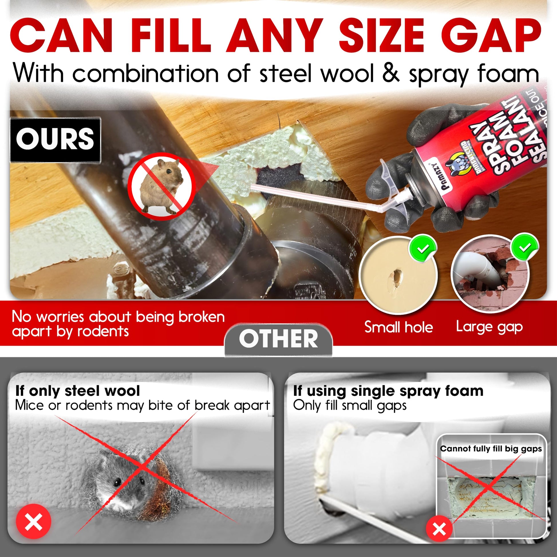 - [Ultimate Rodent Control Solution] Say goodbye to low-quality steel wool that breaks apart and causes a mess. Our product combines premium steel wool with a powerful foam sealant to create a durable, reliable barrier against rodents and other annoying aminals. This long-lasting solution ensures your home remains critter-free, giving you peace of mind knowing you’re protected from unwanted guests all year long.