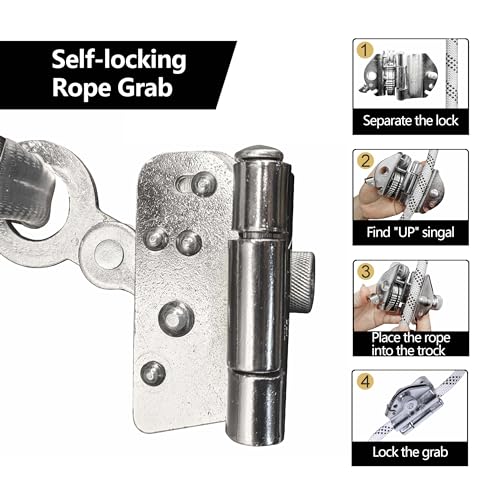 - ¡¼Rope Grab CE EN362 2004¡½Safety harness roofing rope come with double lock-locking screw mechanism and locking clip added two safeguards to your work environment. It is min breaking strength: 3600lbs, meets CE EN362 2004. In addition, anti-panic locking feature allows brake to lock the rope grab onto lifeline in event of a fall, even if the user holds the device open.