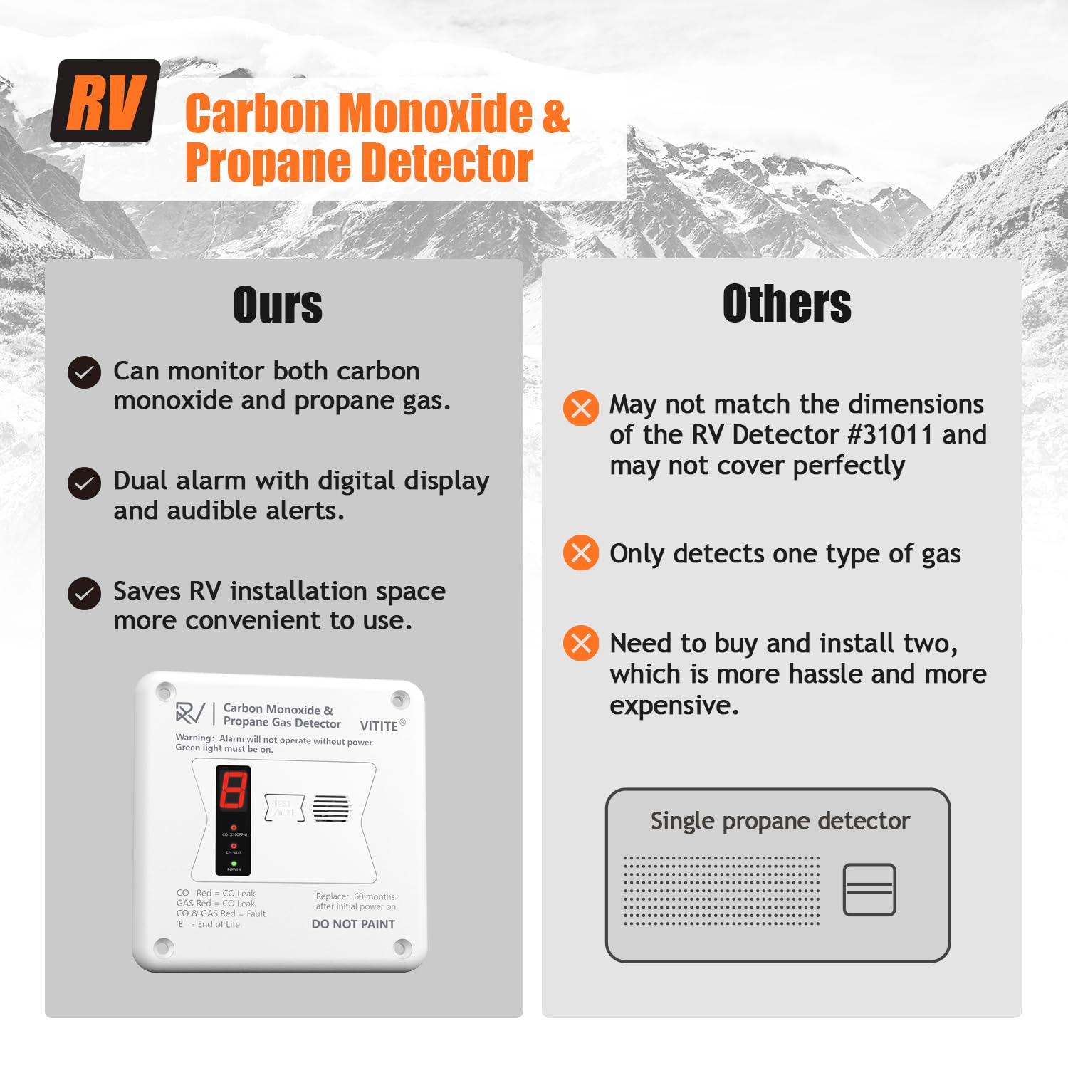 Details: 2-in-1 RV Alarm: Most gas leaks incidents occur at night and during cooking. The VITITE 2-in-1 alarm is ideal for monitoring CO & propane levels inside your RV.