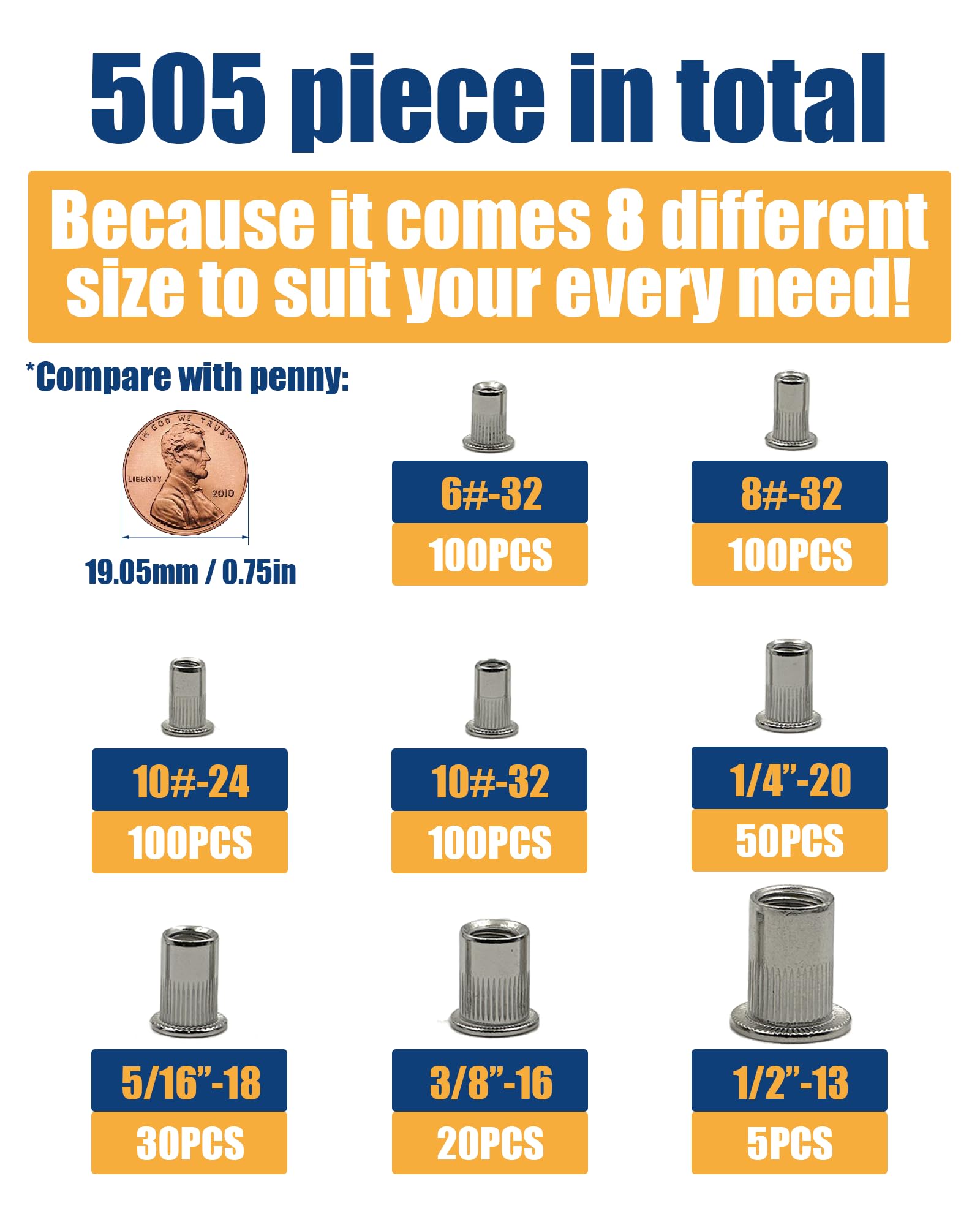 SAE Rivet Nut Assortment Kit 505Pcs 6-32 8-32 10-24,1/4-20, 3/8-16, 5/16-18,1/2-13 304 Stainless Steel Flat Head Threaded Rivet Insert Rivet Nuts