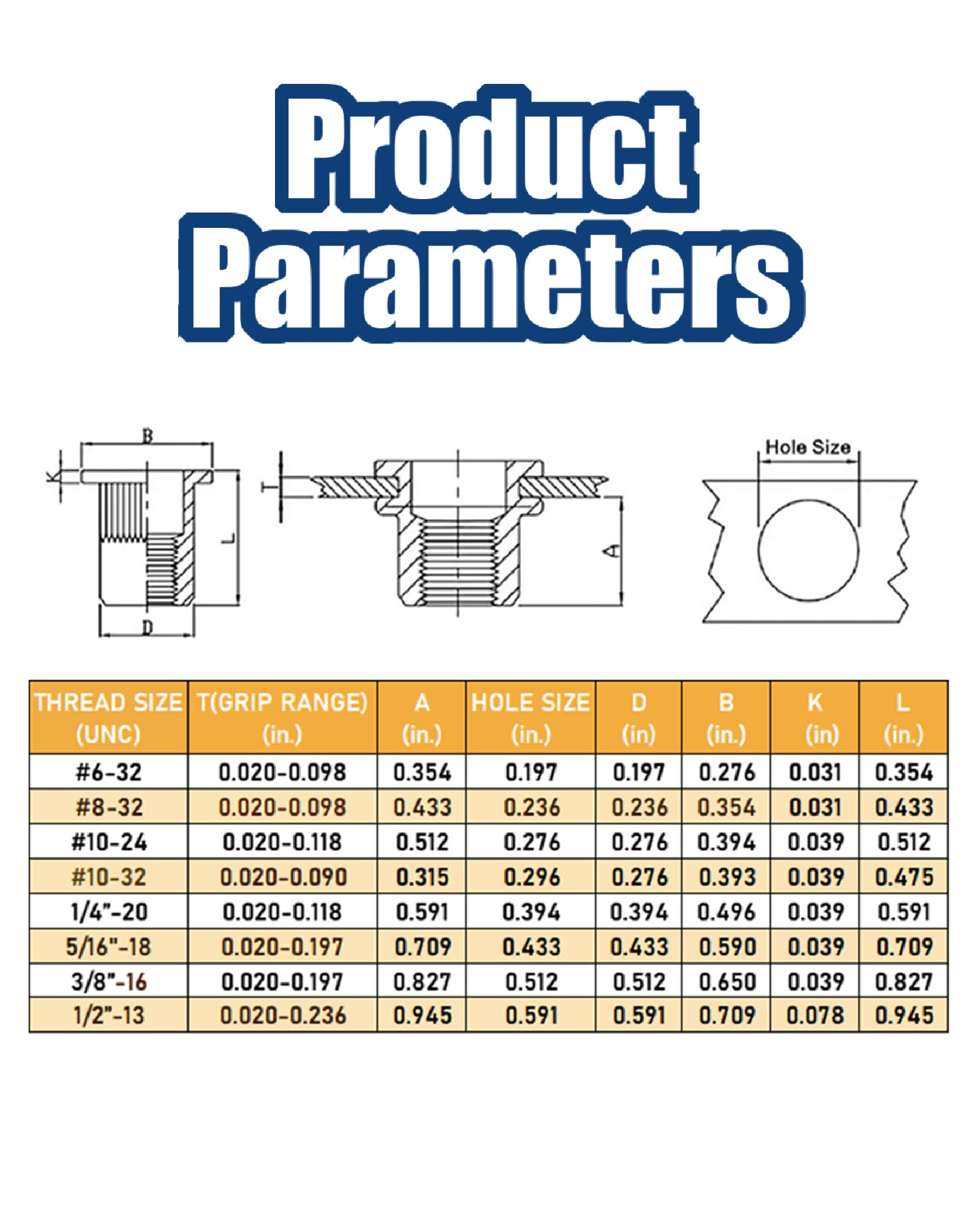 - 【Practical Design】: The rivnuts incorporate a flat-head with vertical threads, featuring both flat and deep threading for easy attachment and a non-slip function, making them simpler to manage and install