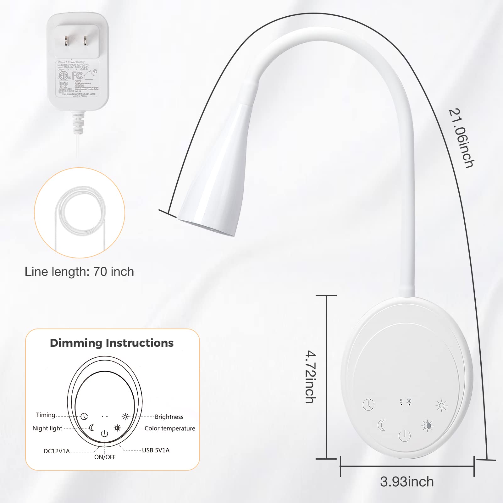 SANKEDOU LED Wall Mounted Reading Light, Book Light for Reading in Bed with Touch Control, 5 Dimmable, USB Output, Night Light & Timers Function, Flexible Gooseneck Headboard Bed Lights (White)