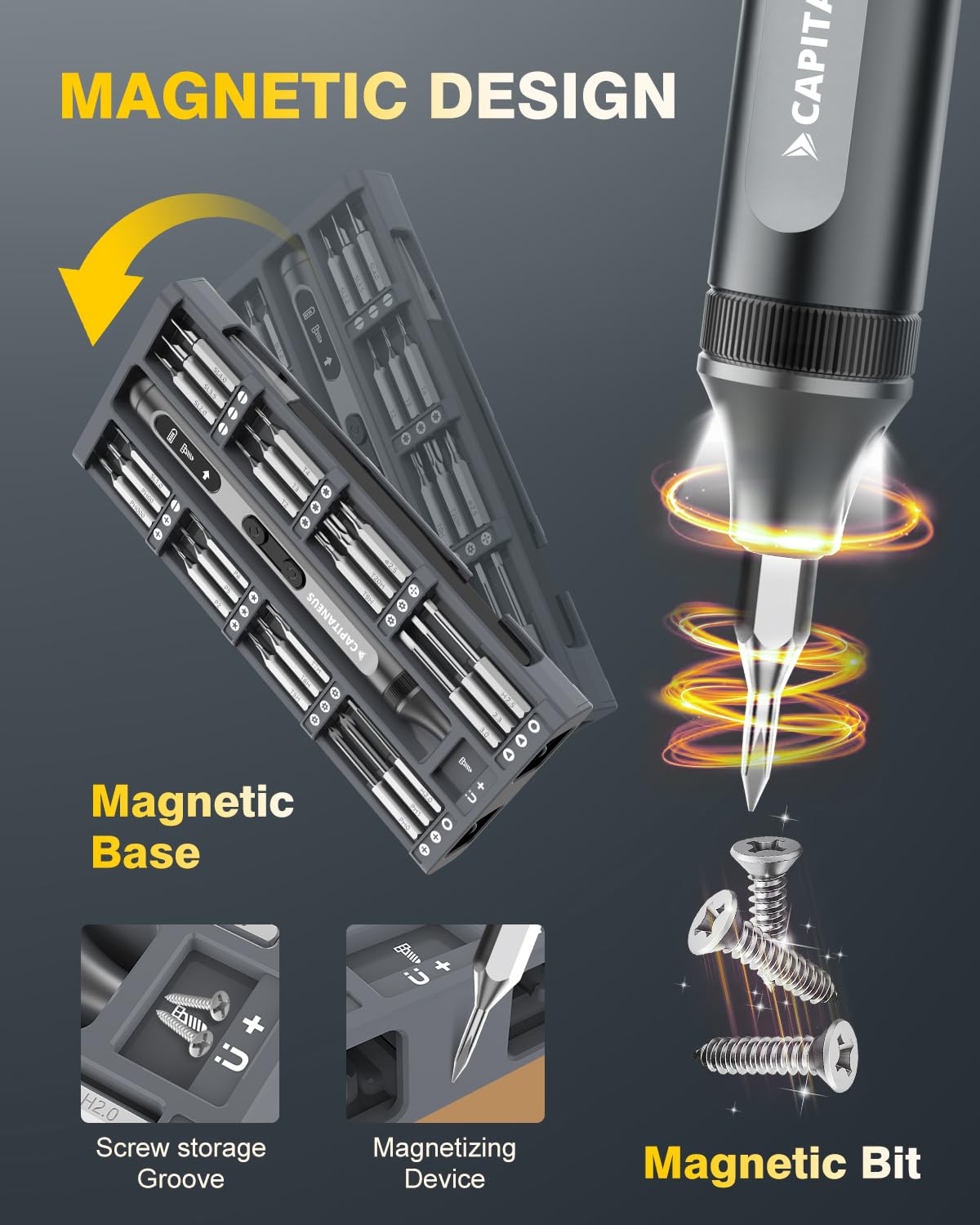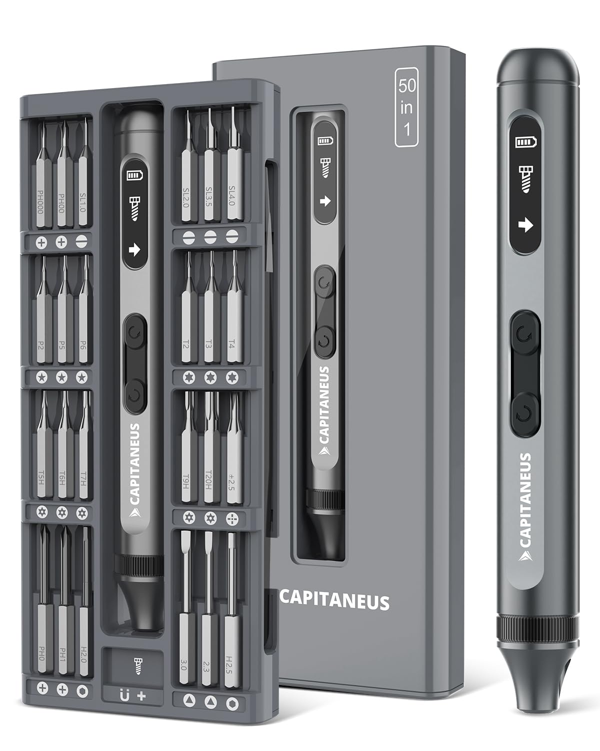 - 50-IN-1 METAL BITS: With 48 bits of 12 categories, the Capitaneus mini electric screwdriver can prepare you for a variety of repair tasks. The S2 hardened steel guarantees a long and safe serving life. A good quality tool makes good quality work.
