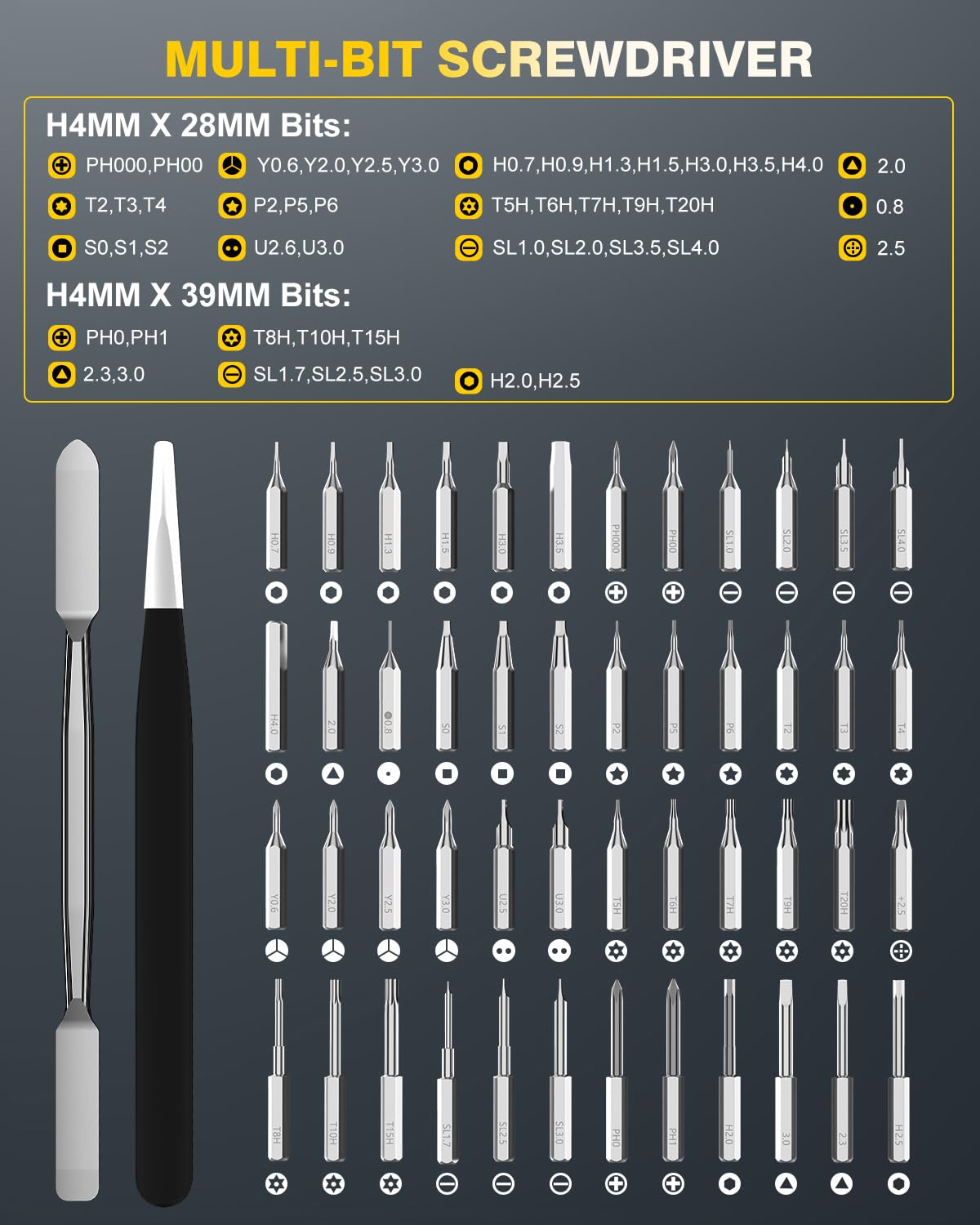 - WHAT'S IN THE BOX: 1x Mini Electric Screwdriver, 1x Storage Case, 48x Precision Bits (see the picture for all bits), 1xTweezer, 1x pry bar, USB Type-C Charging Cable, 1x User Manual.