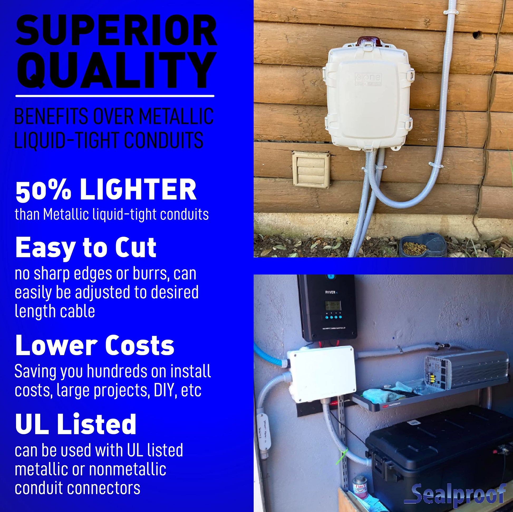 Details: The Sealproof Conduit and Connector Kit includes The Sealproof UL Type B Flexible, Nonmetallic Liquid-Tight Conduit resists corrosion, abrasion, oil, water, acid, metal shavings, and rough environments. Resists abuse, pull and crushing.