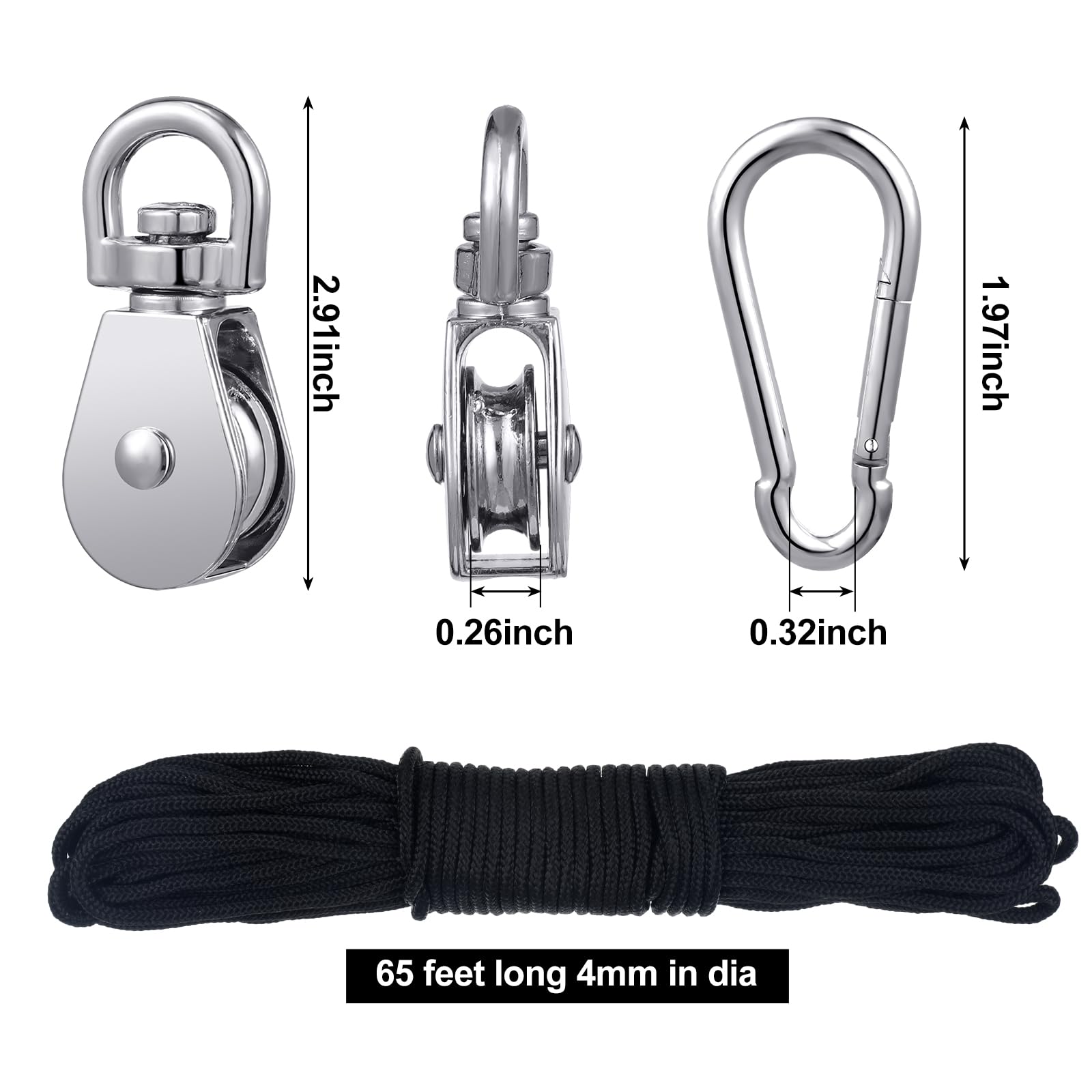 - Useful Rope and Hook: the stainless steel pulley is equipped with practical ropes and hooks; The ropes are not easy to break or crack; The metal hook will be a helpful versatile binding, rigging or anchoring hardware, which can quickly connect or dis connect of ropes, chains and straps, bringing a lot of convenience