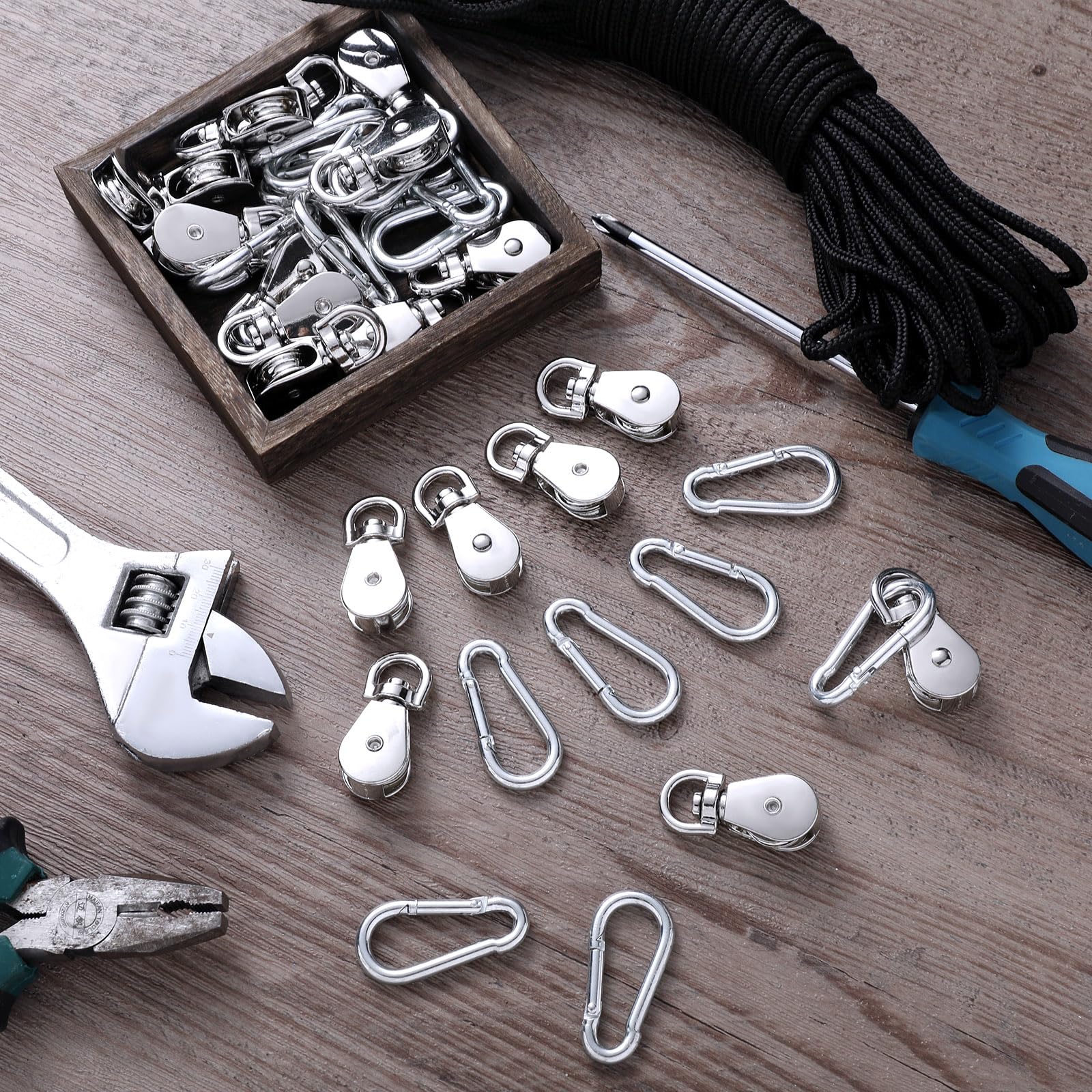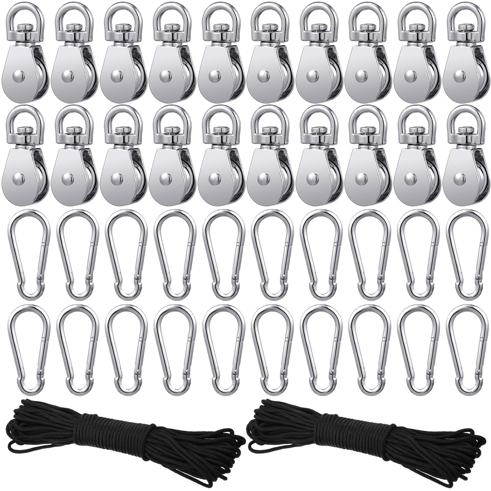 - Complete Set: the package contains 20 pieces of M20 pulleys for lifting, 20 pieces of metal hooks and 2 rolls of 66ft black nylon ropes, a total of 42 items in the package, they are enough for your various needs