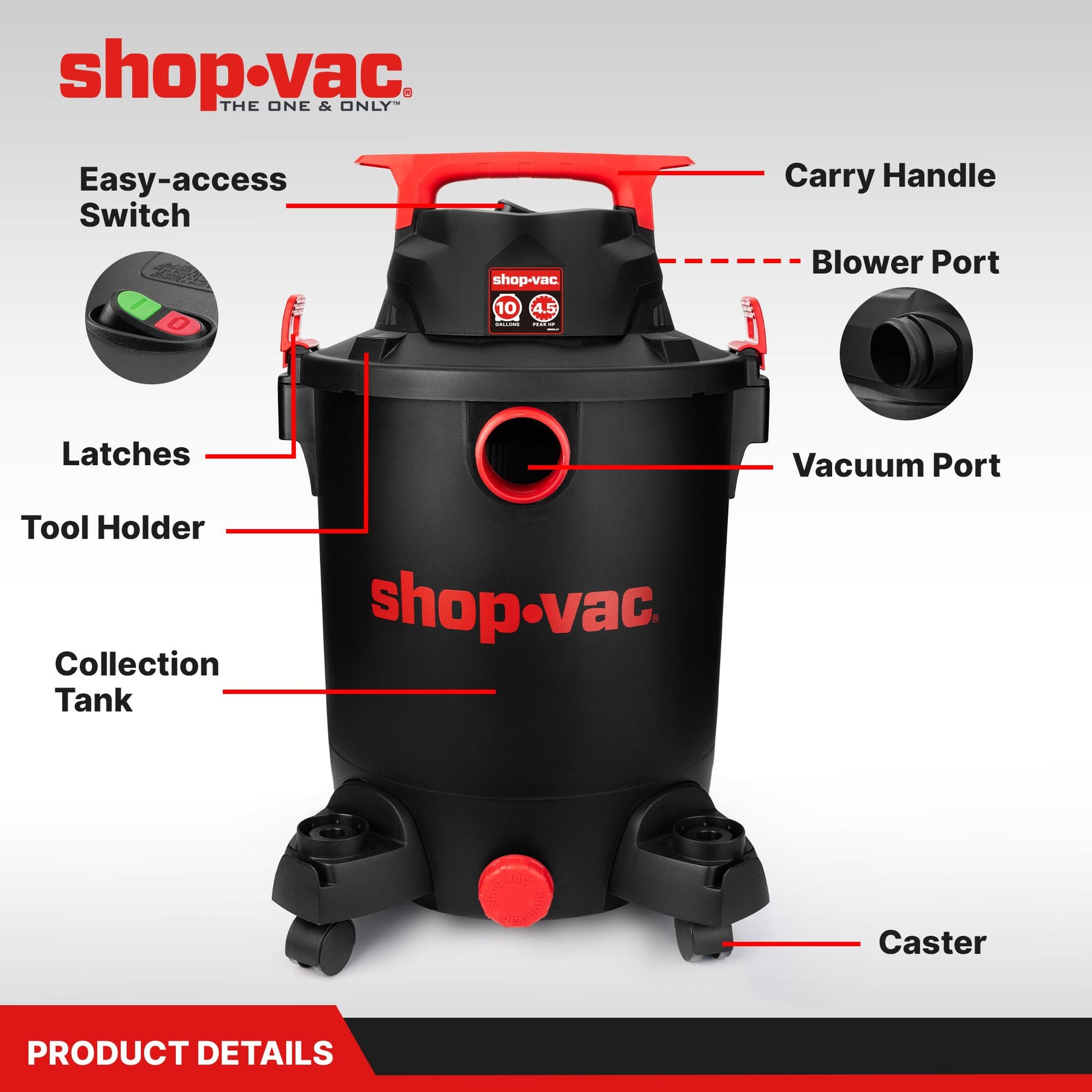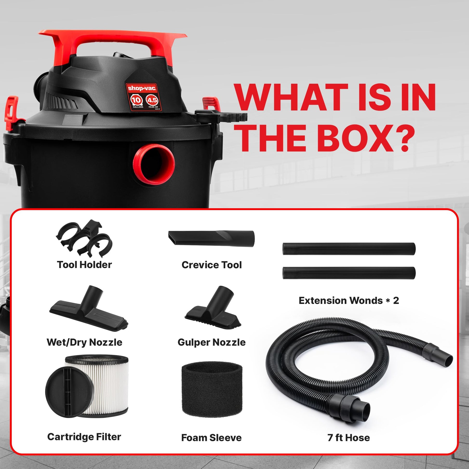 Shop-Vac 5430115 Wet/Dry Vacuum, 10 Gallon, 4.5 Peak HP, 1-7/8 Inch Diameter x 7 Foot Hose, 15 Foot Cord, Ideal for Jobsite, Garage, Workshop & Home