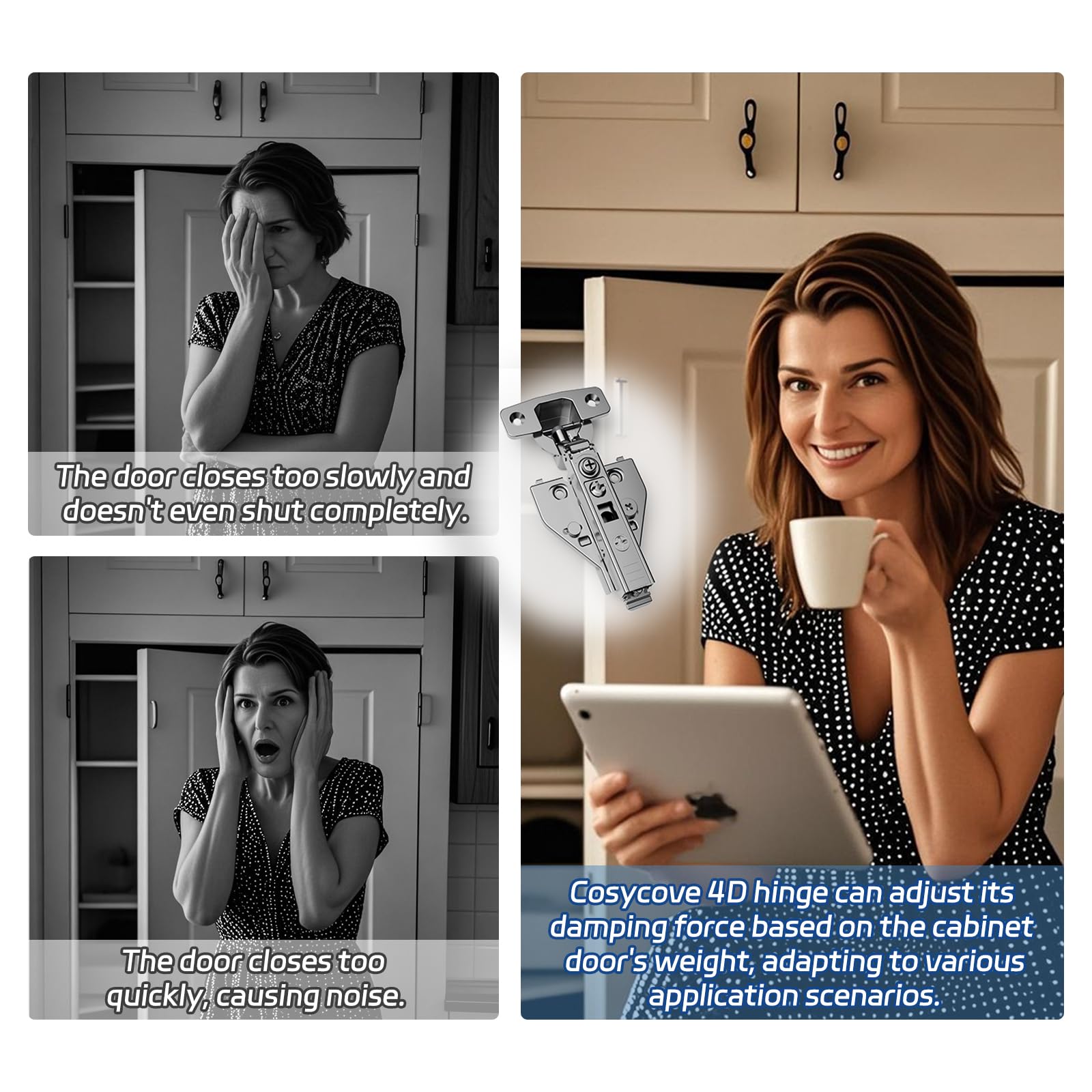 - Premium 4D Adjustable Hinges with Speed Control: Enjoy precise door alignment with 4D adjustability (depth, height, side, and angle), along with speed control for smooth and controlled closing action. Perfect for kitchen cabinet hinges, bathroom cabinet hinges, and all types of full overlay cabinet hinges.