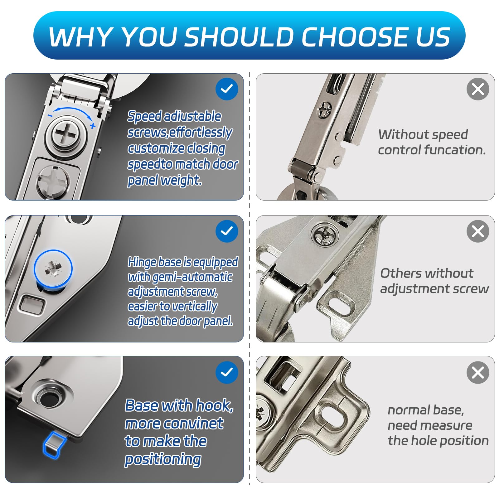- 365-Day Satisfaction Guarantee: We’re confident you’ll love these self-closing cabinet hinges. Test them for a full year, and if they don’t meet your expectations, our customer service team is here to help.