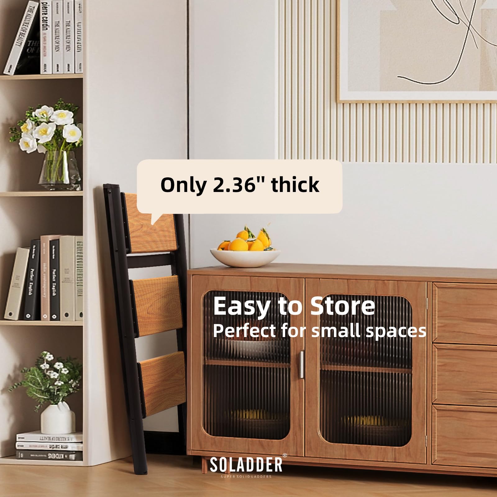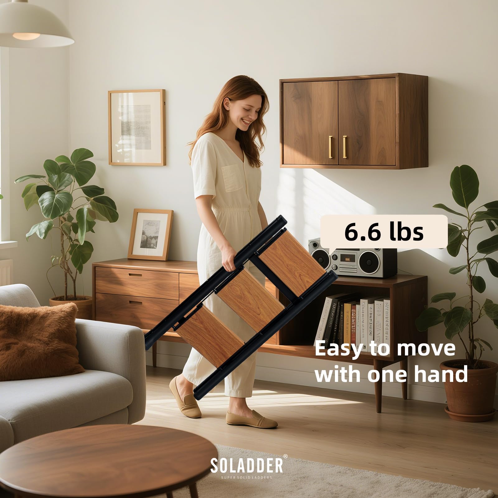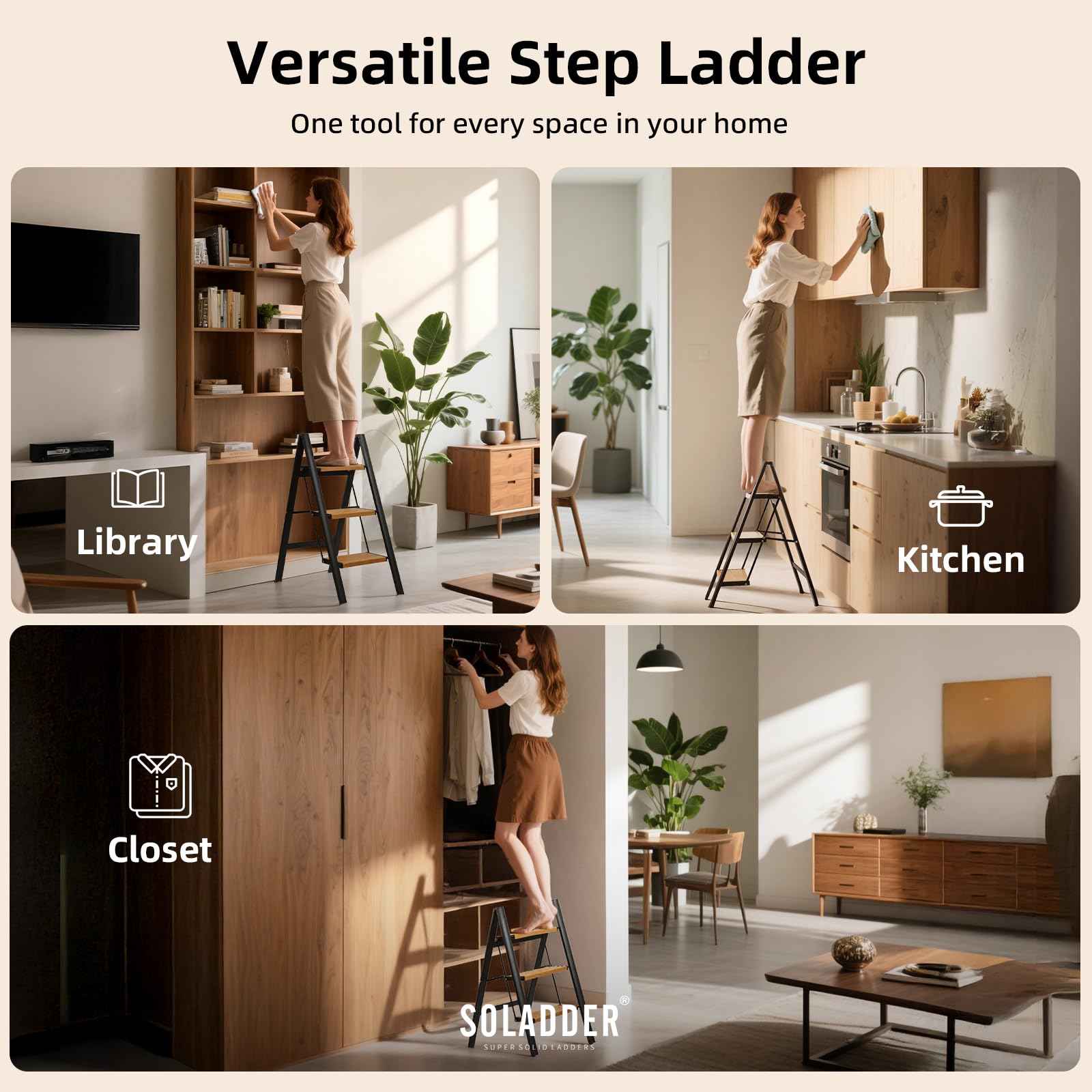 SOLADDER 3 Step Ladder, Anti-Slip and Lightweight Foldable Step Ladder for Adults & Kids to Use in Kitchen,Closet and Library,300lbs(Black+Woodgrain)