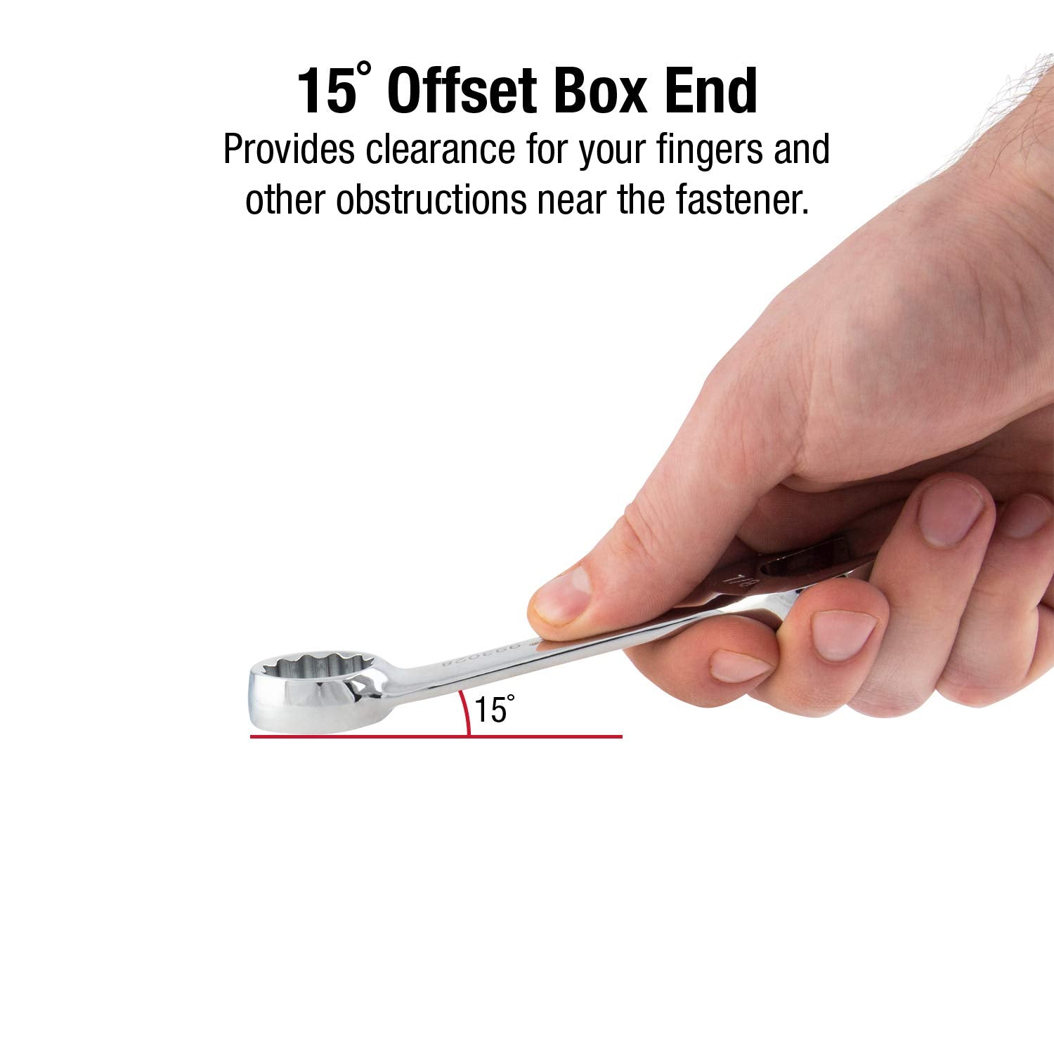 - BOX END OFFSET BY 15 DEGREES: Provides clearance for your fingers and other obstructions near the fastener.