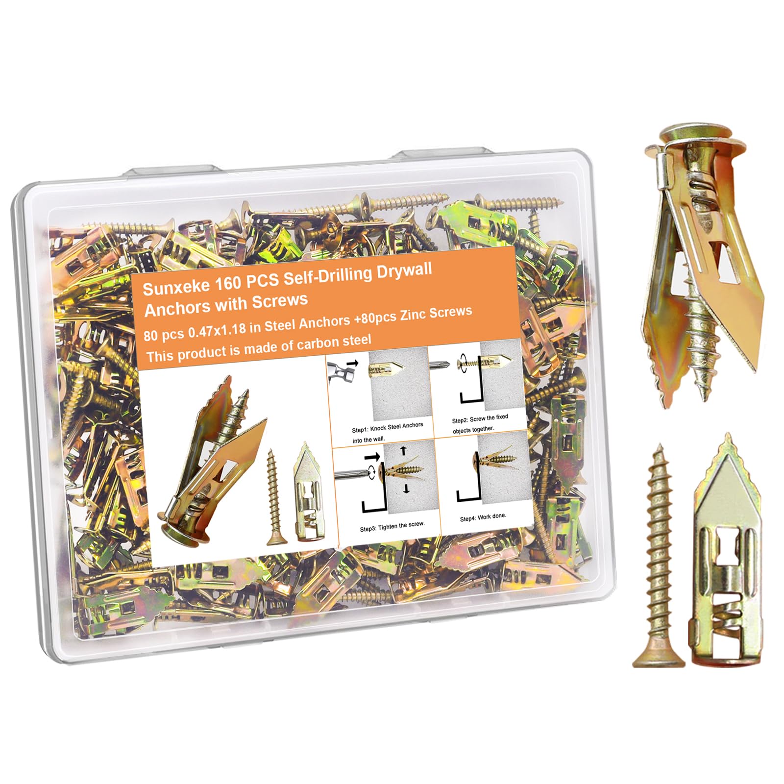 Sunxeke 160 Pcs Self Drilling Drywall Anchors with Screws,80 Sheetrock Anchors (0.47x1.18 Inch) & 80 Zinc Expansion Screws,2025 Upgraded Zinc Plated Steel,No Drill Needed,Hold 66LB for Wall Hanging