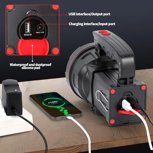 Superbright LED Handheld Searchlight Tactical Waterproof Spotlight High Power Rechargeable Flashlights with Side Light USB Power Charger (White Light)