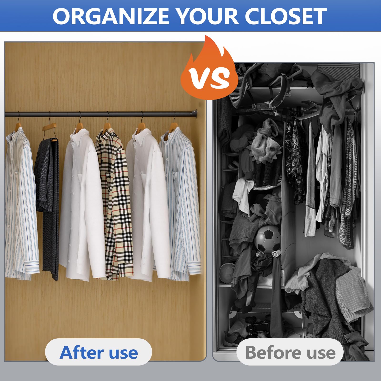 - Adjustable Closet Hanging Rod: The tension rod for clothes comes in two convenient sizes - 17-53, and 17- 82 inches, Tailor your organization with the size that suits your wardrobe best. The closet pole is installed using splicing and spring design for easy extension and fixed length.