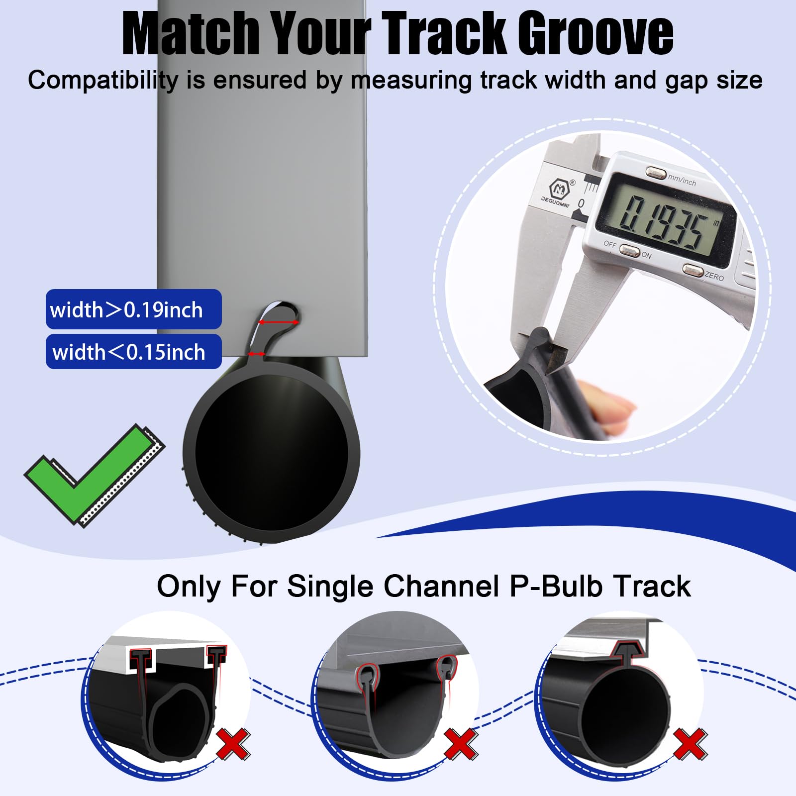- RIGHT Bead Size Matters: Compatibility is ensured by measuring track width and gap size. Small P bulb: Recommended width of p-bulb channel is greater than 0.19'', and the gap underneath is less than 0.15 inches;Big light bulb: Recommended width of p-bulb channel is greater than 0.35'', and the gap underneath is less than 0.15 inches