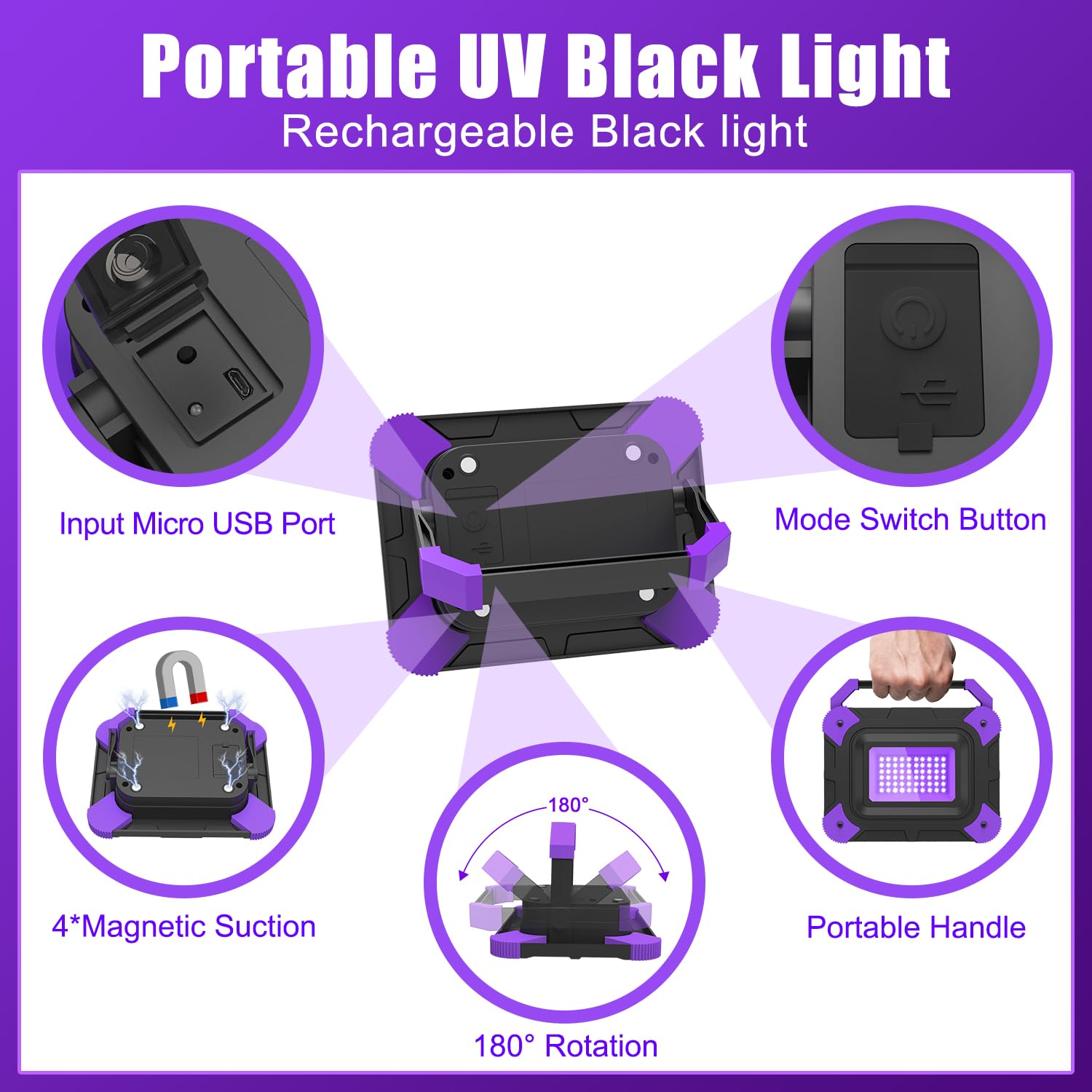 - 【Rechargeable Black Light】T-SUN rechargeable black lights outdoor come with USB charging port, super-bright 60 LEDs and durable ABS housing. This battery powered black light 55,000 hours lifetime, high efficiency, 400-405 NM Wavelength Safe for Eyes and Human Skin.