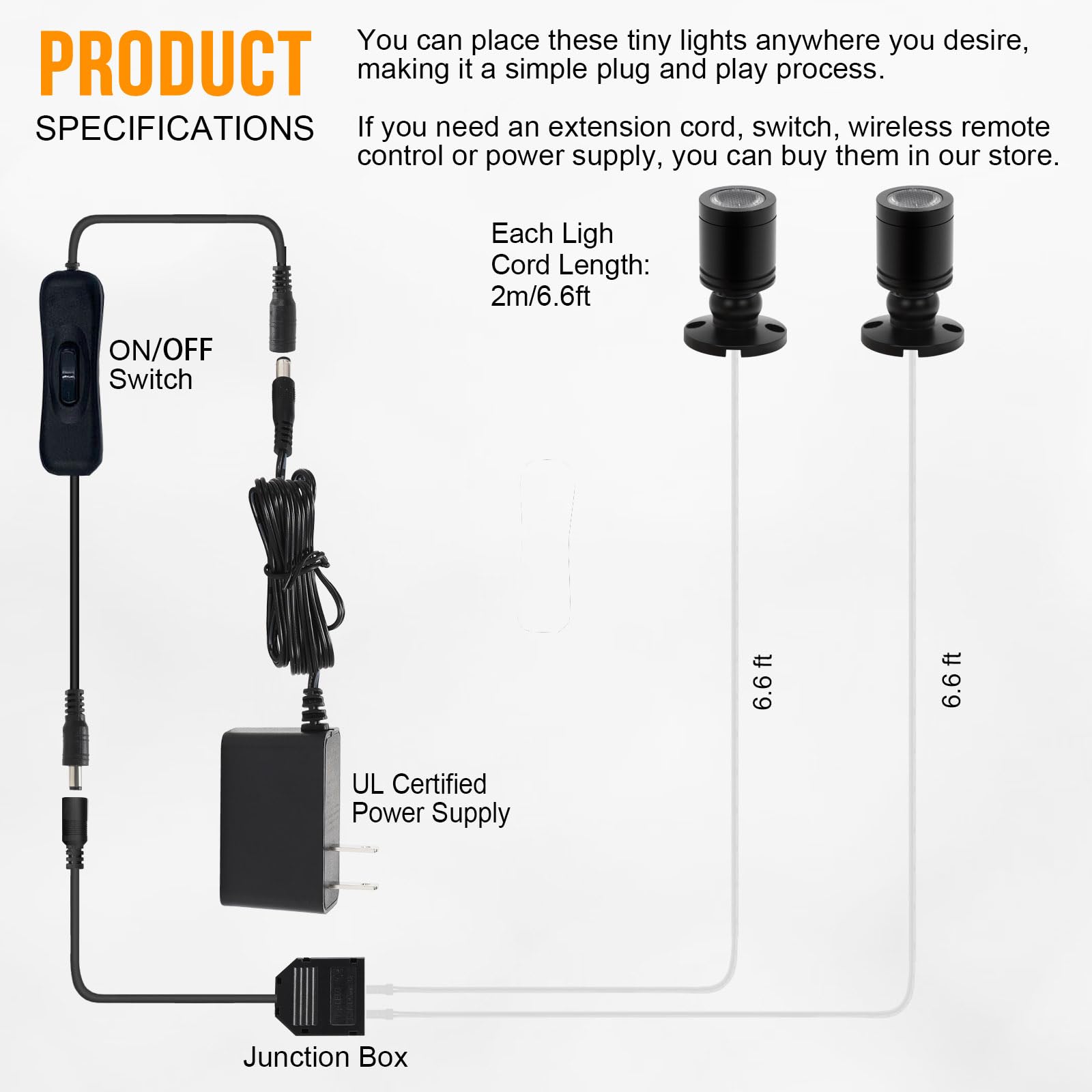 - 【Comfortable & Bright Illumination】Each display lights has 1.5 Watt,100 lumens and 6.6ft length cord.Soft White 3000K,with a Color Rendering Index of 85RA, our spotlights provide high-color accuracy and natural, non-flickering lighting, ensuring your eyes stay comfortable while enhancing your space.