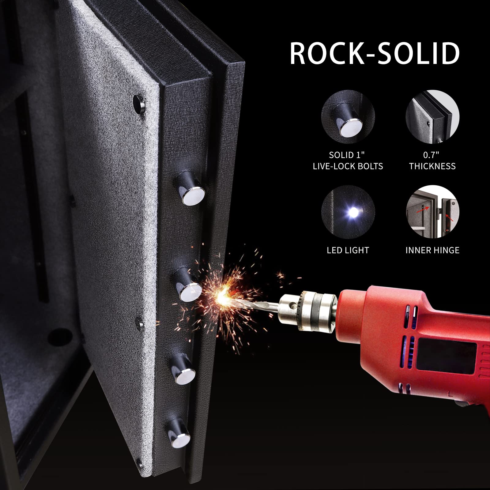 - Large Capacity: You can adjust the position of the two removable dividers up and down according to your needs, which helps to maximize space of security box and keep things more organized. The 3.47 Cubic Feet capacity can easily hold a lot of cash, jewelry, passports, even legal size documents and more.