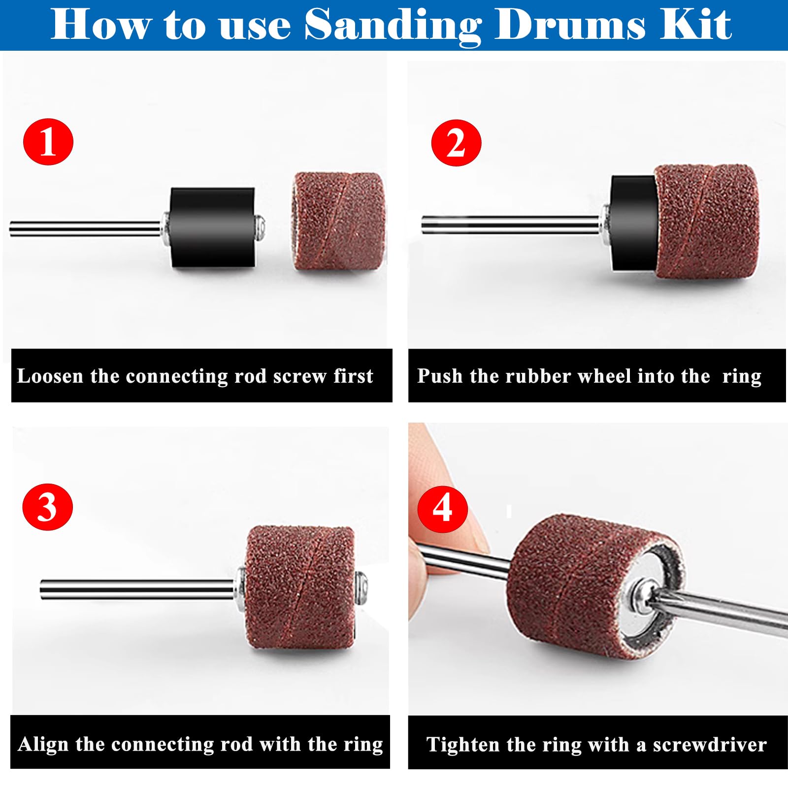 - Easy installation:Push the sanding drums into the drum mandrels, and then tighten the screws of the sanding drum to make the abrasive belt closely adhere to the mandrel (please ensure that the drum is tightened, otherwise the sanding band fall apart from the mandrel when using)