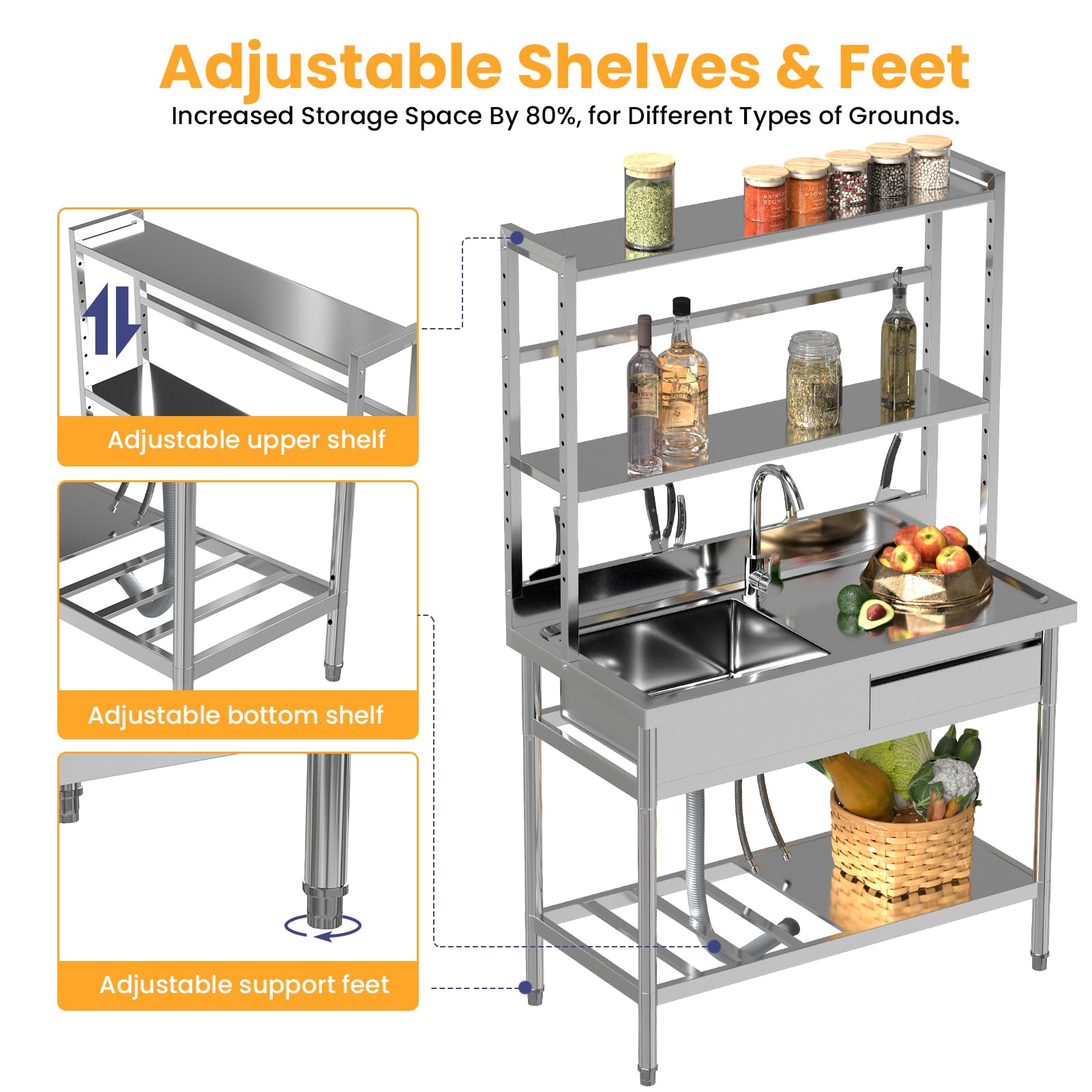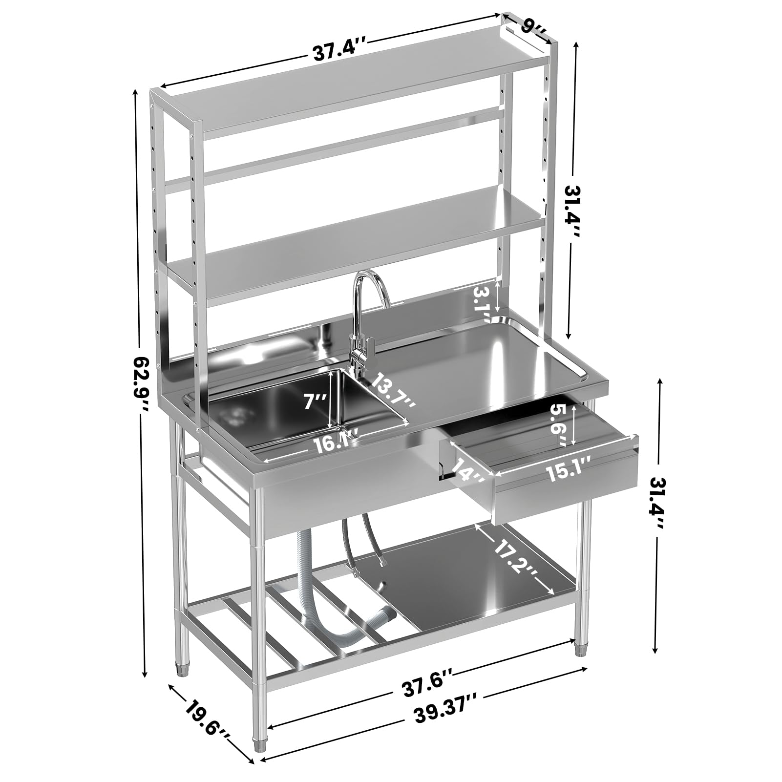 - [LARGE CAPACITY UTILITY SINK SET]: With a 16.1'' x 13.8'' x 7.1'' inner bowl and overall dimensions of 39.5"W x 63"H x 19.7"D, this sink provides ample space. It features a built-in drawer, a bottom shelf for storage, and an upper shelf for easy access, maximizing organization. Adjustable-height legs enhance versatility, making it ideal for backyard or garden grilling.