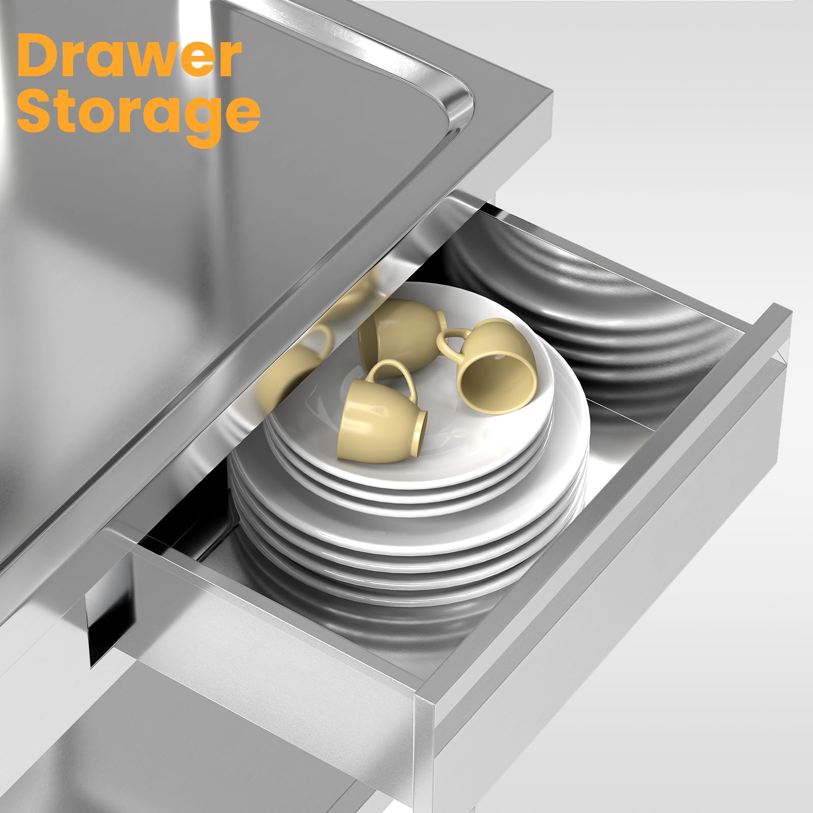 - [UTILITY FREE-STANDING LAUNDRY SINK]: The Toemics stainless steel sink is designed with hot and cold water inlet pipes, a 360-degree rotatable gooseneck faucet, a functional washbasin, a spacious drainage ditch, a storage rack, and a drawer. Perfect for any commercial environment.
