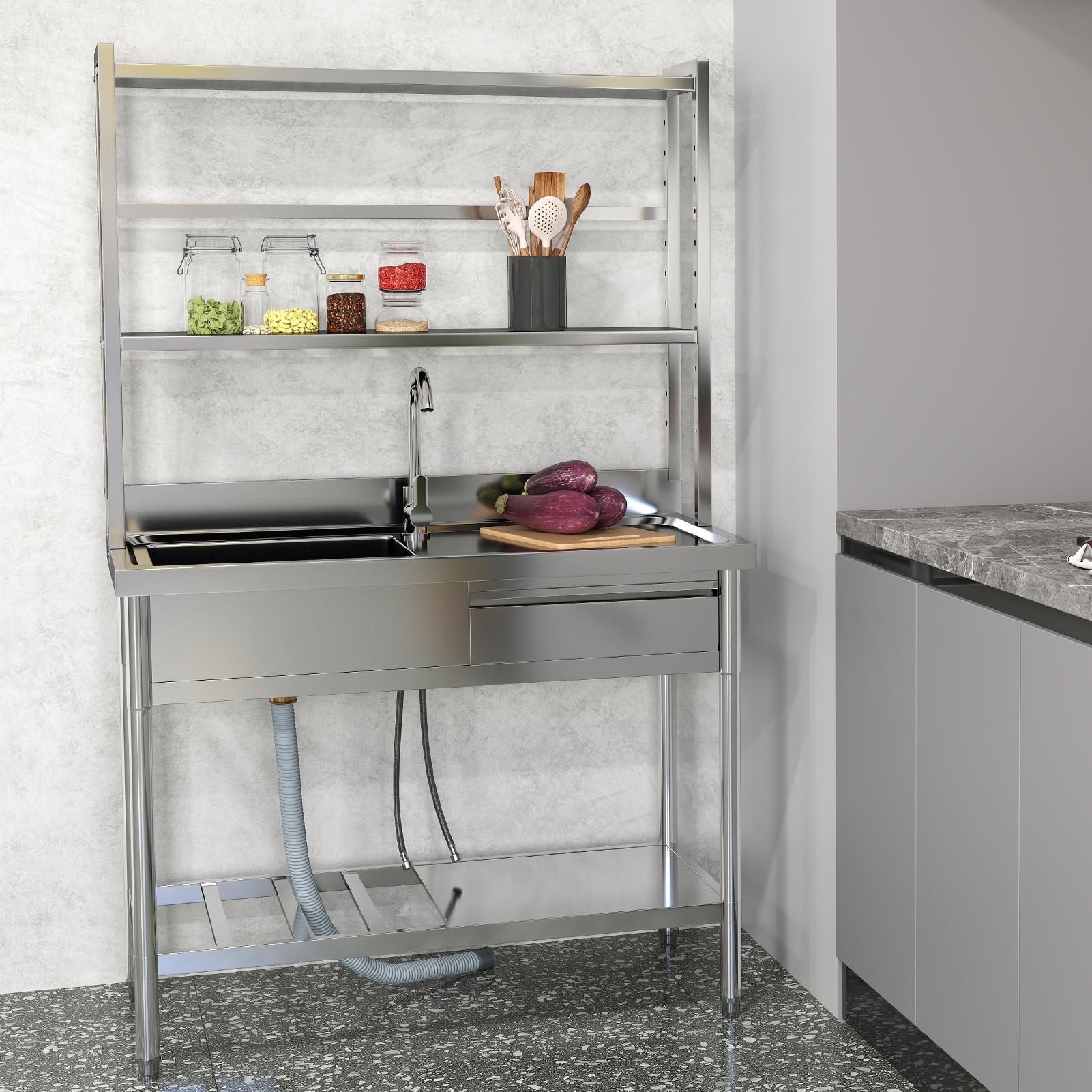 Toemics 39'' Stainless Steel Utility Sink, Free Standing Commercial Single Bowl Sink with Shelves & Right Drawer & Cold and Hot Water Pipe, Indoor and Outdoor Sink for Laundry Room, Garage, Kitchen