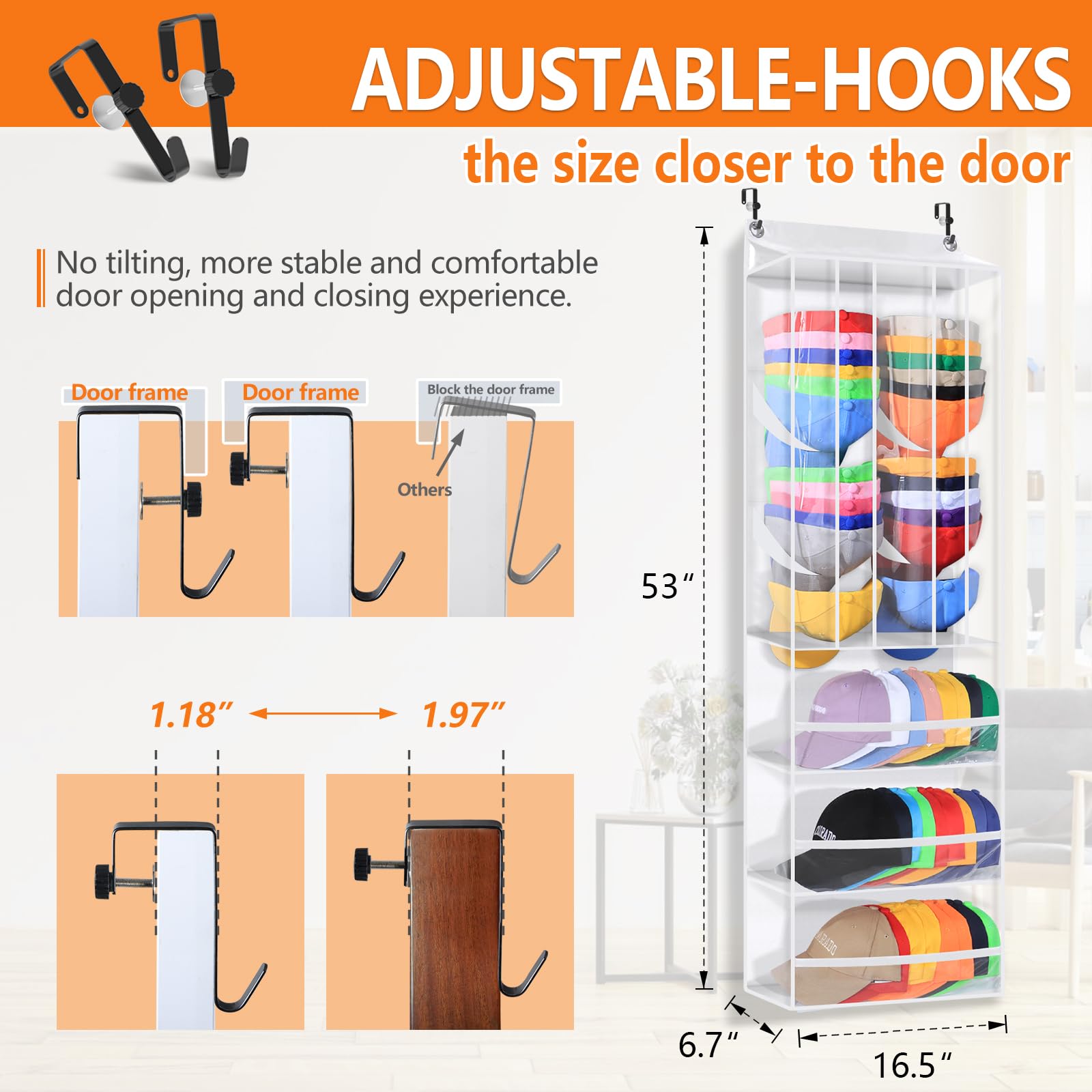 - Instant Visibility & Access - Featuring full-front transparent panels, the Hat Organizer ensures instant visual identification. The over door hat organizer's open-access design allows quick retrieval while maintaining perfect cap shape preservation.