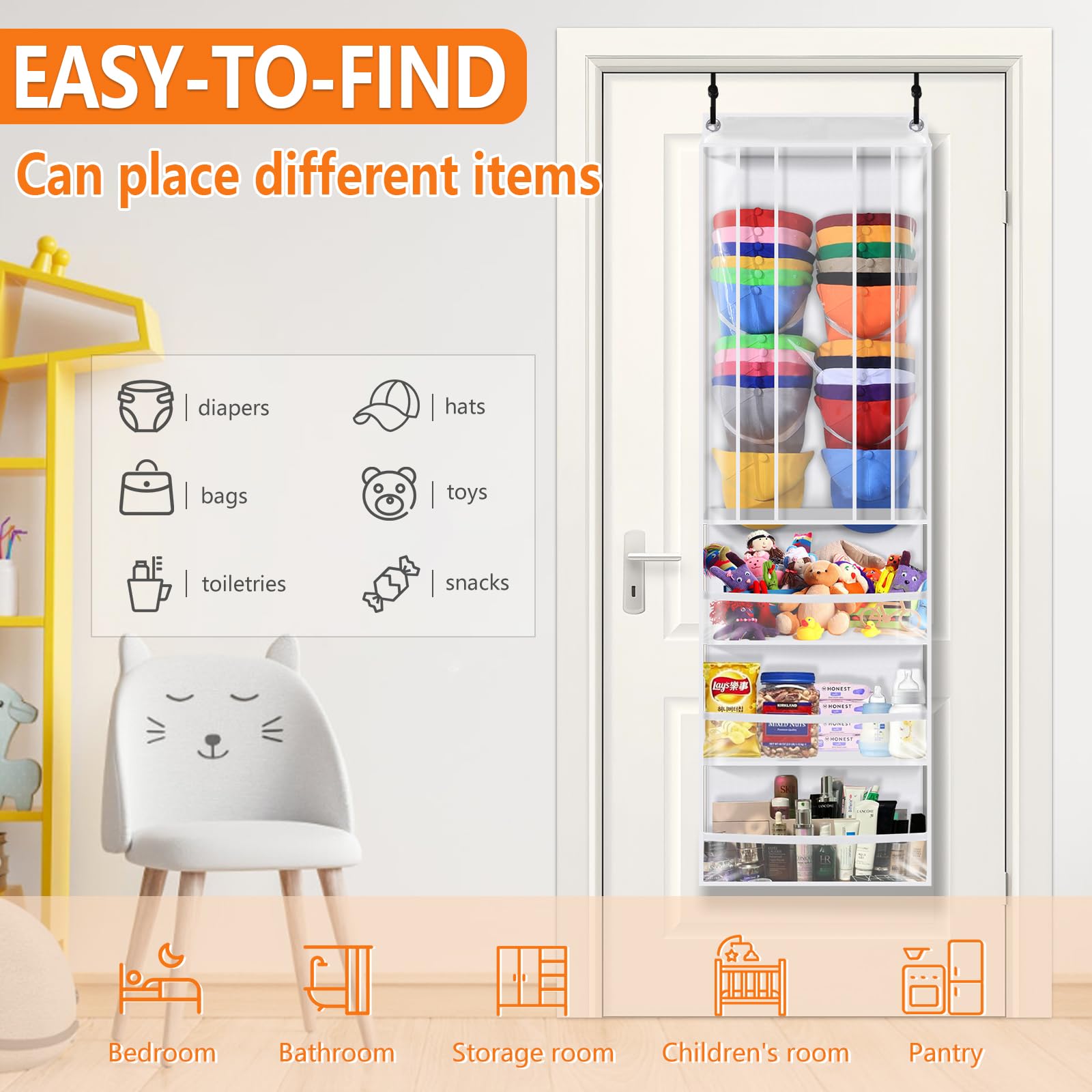 - Versatile Anti-Slip Design - The upper layer of the over the door hat organizer is covered with transparent TPU material and woven tape, achieving a dual safety mechanism to effectively prevent the hat from slipping off. The lower part of the Baseball Hat Organizer perfectly organizes the baseball cap while storing toys, wallets, snacks, socks, scarves, gloves, yarn, accessories, bottles, cleaning supplies, clothes, towels, and cosmetics.