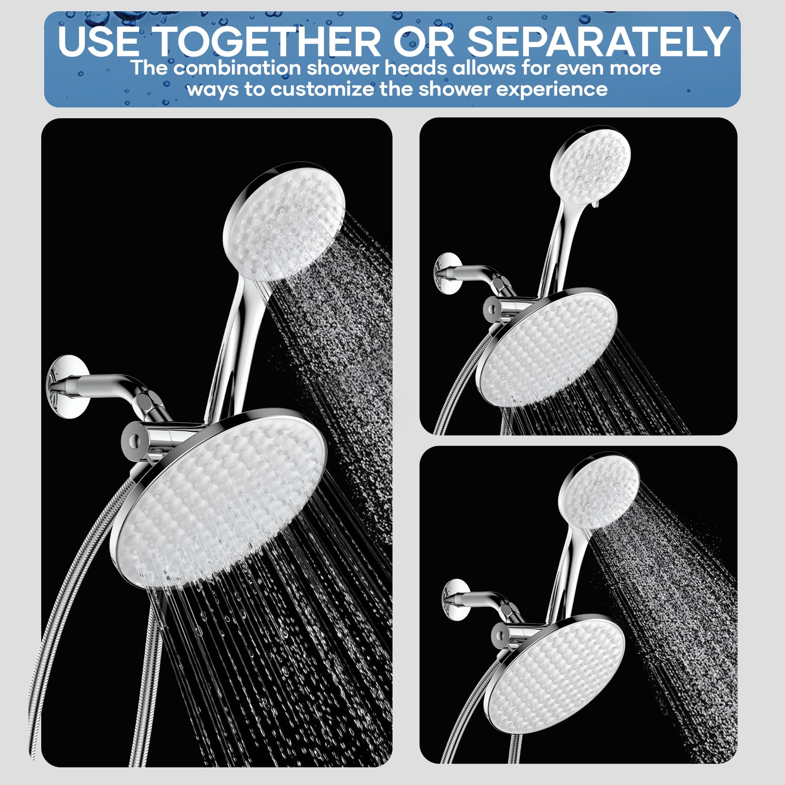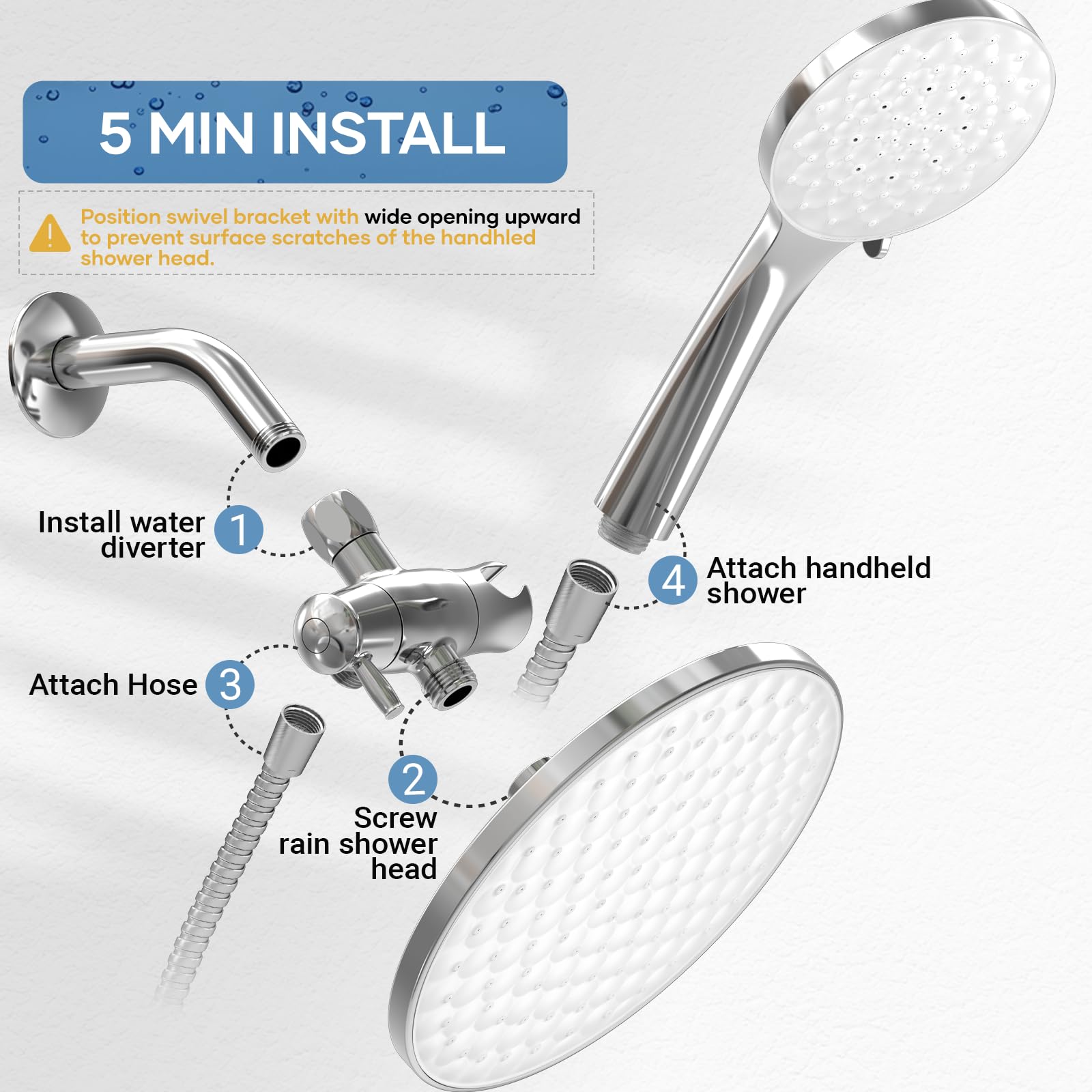 - Includes: 8" Face Angle-adjustable Rain Shower Head, 6-setting 4.8" Face Handheld Shower, 3-way Water Diverter with built-in Bracket and optional-use Anti-swivel Lock Nut, Stainless Steel 71" Shower Hose, Washers, Teflon Tape and Installation Manual
