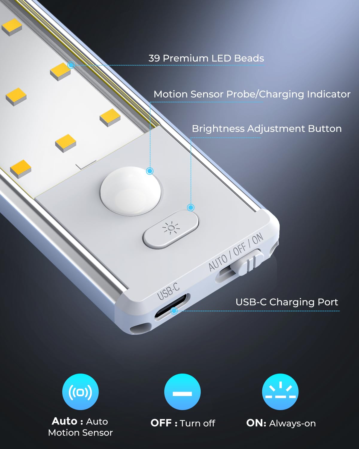 - 【Dimmable Under Cabinet Lighting】: The 39 LED bulbs provide ample illumination without being too harsh. And there is a button for dimming from 10% to 100% brightness. The dimmable feature of the under cabinet lights allows you to adjust the brightness depend on the time of day to suit your preferences or specific lighting needs