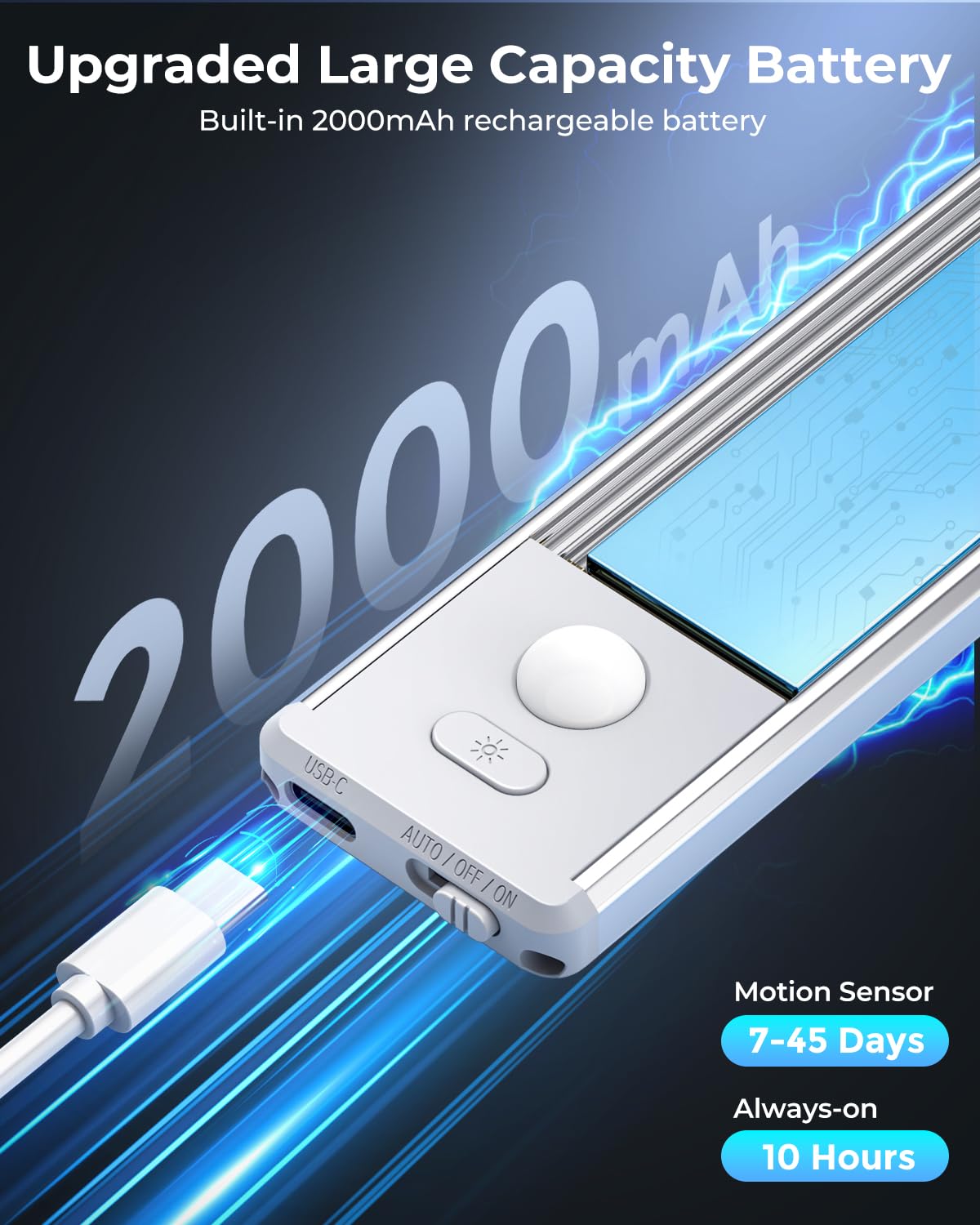 - 【USB-C Rechargeable Under Counter Lights for Kitchen】: These led lights have a built-in 2000mAh rechargeable battery providing long-lasting light and can be easily recharged with the included USB-C cables instead of constantly replacing disposable batteries. On a single charge, it can last about 30-60 days with moderate use on Auto mode, or last 10 hours on Always-on Mode at Max brightness